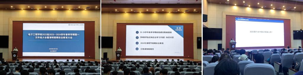 为深化校园安全责任意识,铸牢学生安全防线,做好清明节假期安全教育工作,强化学生安全意识,预防和减少各类安全事故的发生,营造安全、有序、健康、文明的校园环境,电子工程学院各年级利用年级大会、主题班会等方式于2024年3月27日-4月2日开展清明假期安全教育。