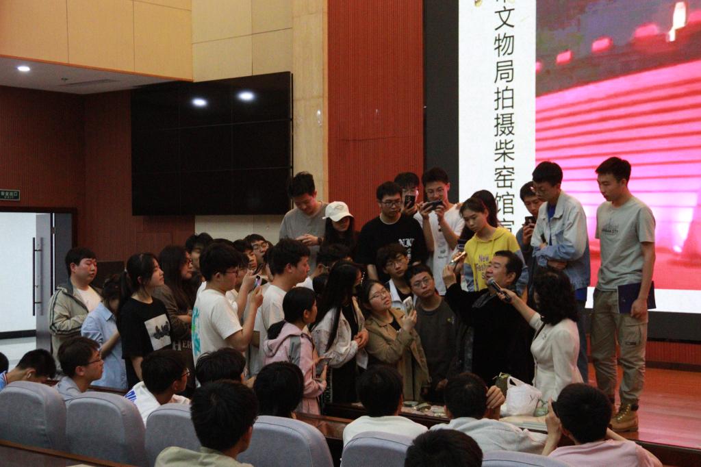 王学武首先对中国唯一以五代后周皇帝“柴荣”姓氏命名的御窑瓷器——柴窑的历史起源、修复保护、文化传承等方面进行了讲解。他指出,柴窑作为古代“五大名窑(柴汝官哥定)”之首,距今已有1000多年,柴荣皇帝曾御批柴窑为“雨过青天云破处,这般颜色做将来。”,具有“青如天、明如镜、薄如纸、胎如玉、声如磐”的特点,被誉为“诸窑之冠”,尊称为“中国瓷皇”。其次,他对自上世纪90年代开始,本人与夫人寇玉徽放弃原有工作,一起从西安城建中挖掘出现的碎瓷片,开始踏上了抢救保护研究传承柴窑的艰辛路程,以及于2009年在文物部门大力支持下,创建集柴窑文物抢救征集、修复保护、收藏研究等为一体的西安柴窑文化博物馆的初心使命与奋斗历程进行了介绍,勉励广大同学要坚定文化自信,积极学习中国传统优秀文化,勇于担当社会责任,努力成为具有高度文化自信的新时代好青年。最后,他与现场同学进行了互动交流,对大家提出的问题逐一进行了解答。