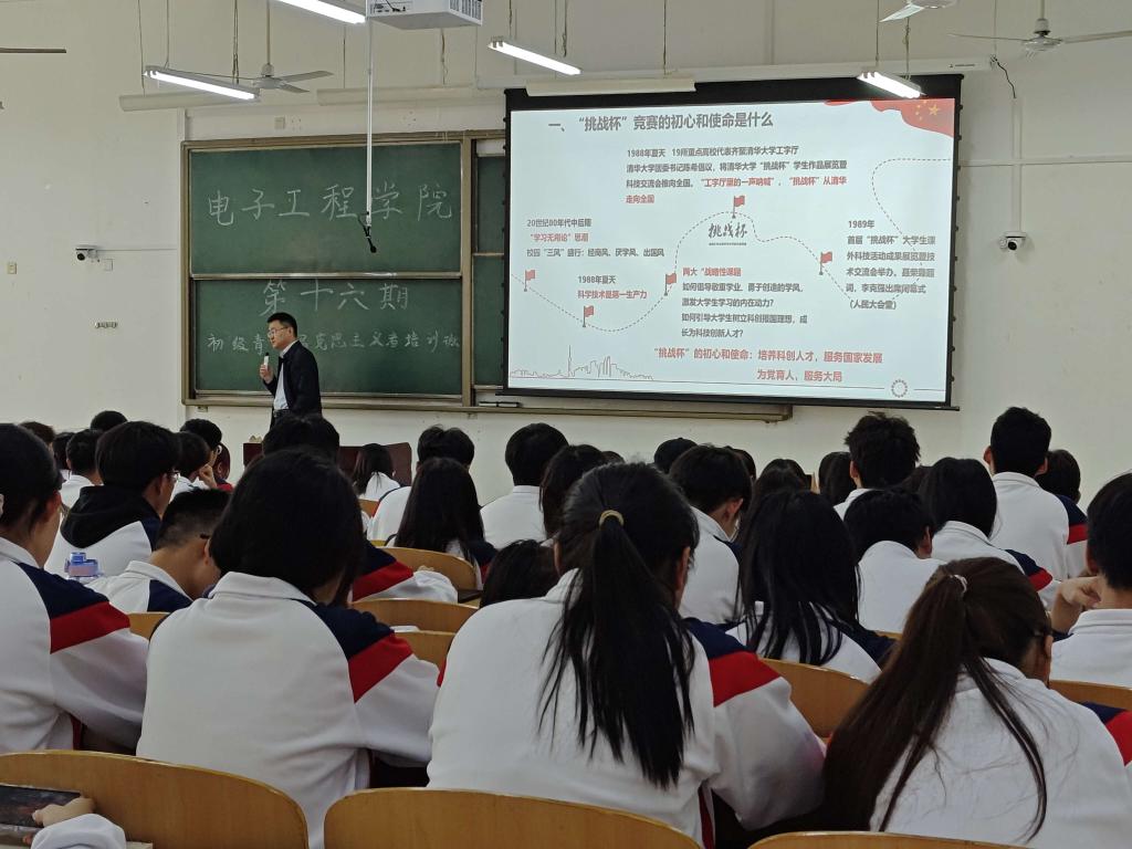 4月10日下午,电子工程学院主办的“第十六期青年马克思主义者初级培训班”第四讲在博思楼B121举行。本次培训由校团委书记何国强主讲,电子工程学院团委书记钱宇航主持,200余名学员参加。