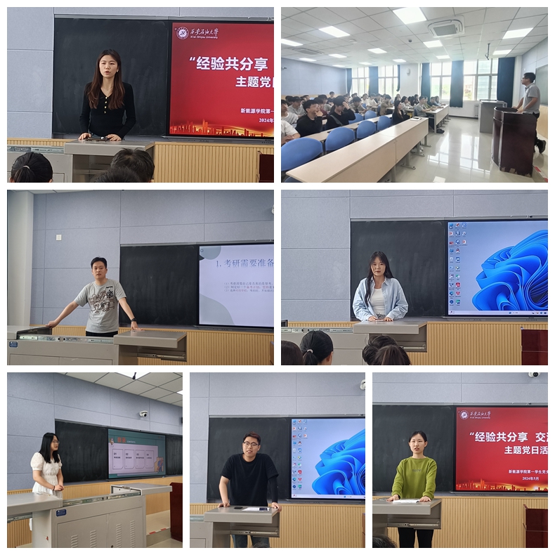 为实现校党委“一校一策”选题“推动新能源学院高质量发展”各项目标任务高质量完成,深化党建引领业务发展,进一步加强学院学风建设,正确引导2025届学生明确考研就业形势,做好个人发展规划,5月8日-11日,新能源学院各学生党支部组织开展“经验共分享,交流促成长”主题党日活动,活动由各学生党支部书记主持,2024届考研就业典型及全体2021级学生参加。