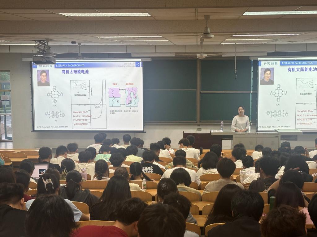 515日晚,学院新程大讲堂第8讲“光伏发电技术-有机太阳能电池”在鄠邑校区A139室开讲。本次讲座特邀学院新能源材料与器件系高欢欢担任主讲,学院2023级全体学生参加。讲座中,高欢欢首先介绍了自己的学习和工作经历,接着向大一的同学们科普了当前全球能源的严峻形势,强调新型绿色能源的开发和利用的必要性和紧迫性,详细解读了“双碳”战略提出的背景和重大意义,并由此引入讲座的主题“体相异质结有机太阳电池”。通过对从“器件效率”-“大面积柔性模”-“低成本光伏器件”-“绿色溶剂”-“稳定性/寿命”不同发展阶段,以及工作原理的详细讲解,让同学们对自己所在的学科背景和知识有了更深层次的认识。最后,高欢欢向同学们介绍了体相异质结有机太阳能电池的发展趋势,以及光伏器件和活性层的制备过程和方法,并结合学院的课程设置,带领同学们进一步了解所学专业的培养方案和培养目标,鼓励同学们不断提高自身专业能力,在专业领域持续深耕,积极投身到我国的新能源行业建设当中去。