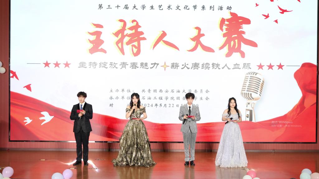 为进一步丰富校园文化生活,展现学生精神风貌和青春风采,培育和选拔优秀主持人才,5月22日晚七点,由共青团beat365官方网站委员会主办,石油工程学院团委、学生会承办的“主持绽放青春魅力,薪火赓续铁人血脉”主持人大赛在弘石学术报告厅隆重举行。党委办公室(校长办公室)副主任、鄠邑校区管理办公室主任黄建礼,校团委书记何国强、党委学生工作部副部长、学生工作处副处长毕轶慧,党委保卫部副部长、保卫处副处长袁坤,计算机学院党委副书记庞远、理学院副院长折延宏、石油工程学院党委副书记张建高、党委学生工作部思想教育科科长孙剑秋、校团委副书记孙浩哲出席并担任评委,兄弟院系团委学生会负责人及300余学生参加了活动。