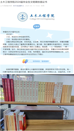 倡议:为加强学院党建办公室读书角建设,6月8日,土木工程学院面向41名毕业生党员发出了“我为学院捐赠一本好书”倡议,为学院建设做出绵薄之力。为了让毕业生能明确毕业流程和知悉相关注意事项,确保顺利离校,6月15日,学院面向全体毕业生发出了“土木工程学院2024届毕业生文明离校倡议书”,号召全体毕业生,牢记习近平总书记对广大青年的嘱托,争做有理想、敢担当、能吃苦、肯奋斗的新时代好青年,在推进强国建设、民族复兴伟业中展现青春作为、彰显青春风采、贡献青春力量,奋力书写为中国式现代化挺膺担当的青春篇章。