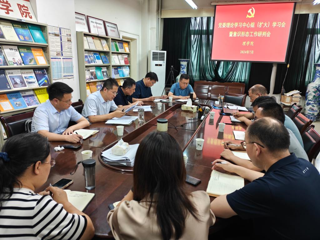 7月3日下午,理学院党委在雁塔校区东方石油楼501室召开理论学习中心组(扩大)学习会暨意识形态工作研判会,学院党委理论学习中心组成员、教工党支部书记参加会议,会议由学院党委书记席利哲主持。