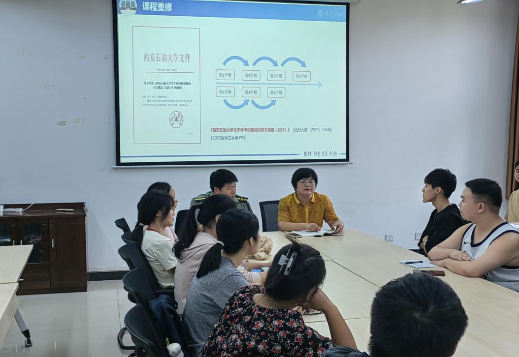 会上,尹老师以《beat365官方网站关于补考和重修的有关规定(试行)》(西石大教〔2021〕126号)为切入点,详细讲解了学籍异动学生关心的各类课程问题;同时从学籍管理角度,再次提醒21级准毕业生核对个人课程和成绩,尤其要对公共课加强查漏补缺,鼓励他们第7学期课程务必好好学习全部通过。