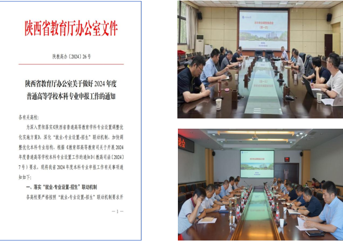 1.积极开展专业设置优化调整工作。根据教育部《关于开展2024年度专业设置工作的通知》(教高司函〔2024〕7号)及《陕西省教育厅办公室关于做好2024年度普通高等学校本科专业申报工作的通知》(陕教教高办〔2024〕26号)文件,教务处积极学习领会文件精神,经充分研讨和调研,下发了《关于做好2024年本科专业设置及启动2025版专业人才培养方案修订工作的通知》,并提供了beat365官方网站本科专业招生率、就业落实率情况统计表(2020-2023年)、2021-2023年高校专业情况统计表、专业设置优化调整参考意见等资料,积极促进各院(系)开展设置调整计划。8月4日、8月29日,学校2次召开了本科专业调整专题研讨会,张君涛副校长对本科专业调整优化作了全面部署;9月2日,学校召开院系专业调整务虚会并进一步研讨确定了本年度专业调整方案。