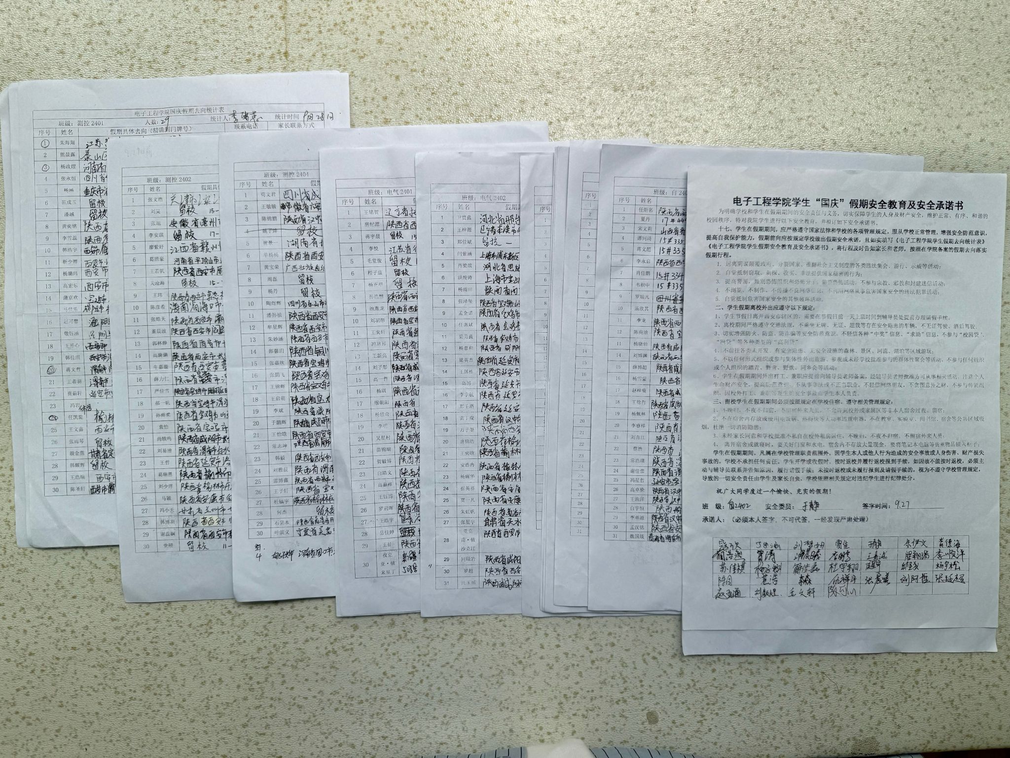 会后,各年级组织签署了《电子工程学院学生2024年国庆假期安全责任承诺书》和《电子工程学院学生2024年国庆假期去向统计表》。