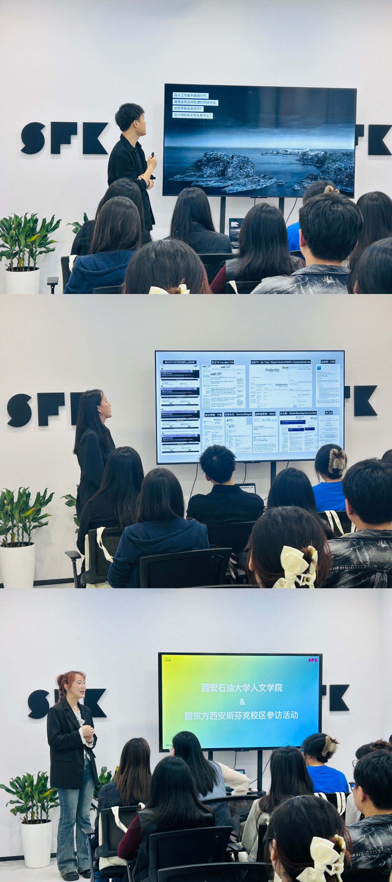 在带队老师的带领下,参访学生参观了斯芬克西安校区的科系专业涵盖、学习设备、学习环境以及各个专业学生的作品展示。参观过后,校区讲解老师开展了视觉传达设计和环境设计两类专业方向的讲座,他们分别从学习目的、就业方向指导、行业发展趋势以及国外高校新形势等方向进行了专业讲解指导,为同学解答了关于专业学习与就业相关的问题。