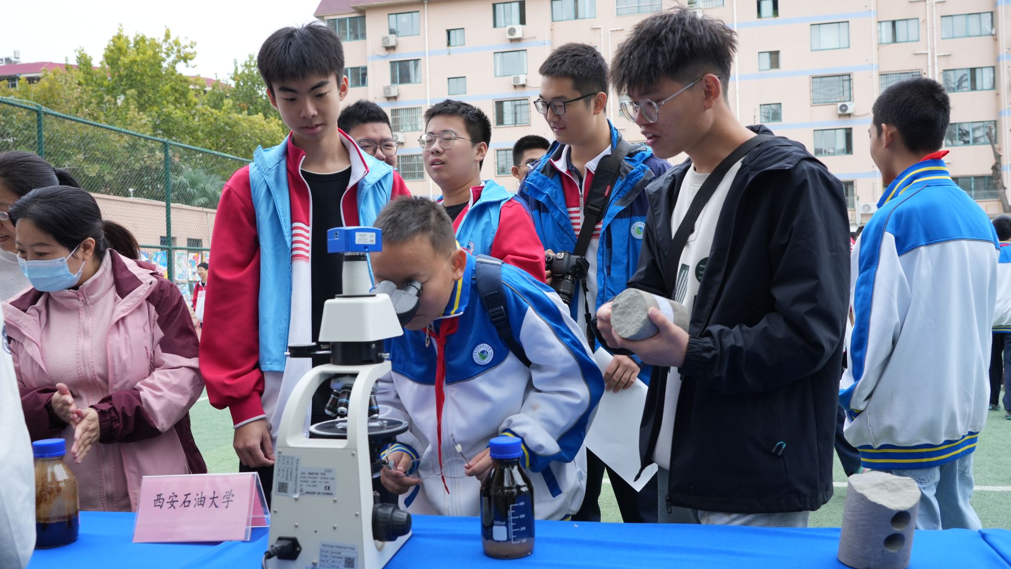 活动现场,同学们正在观察岩石薄片