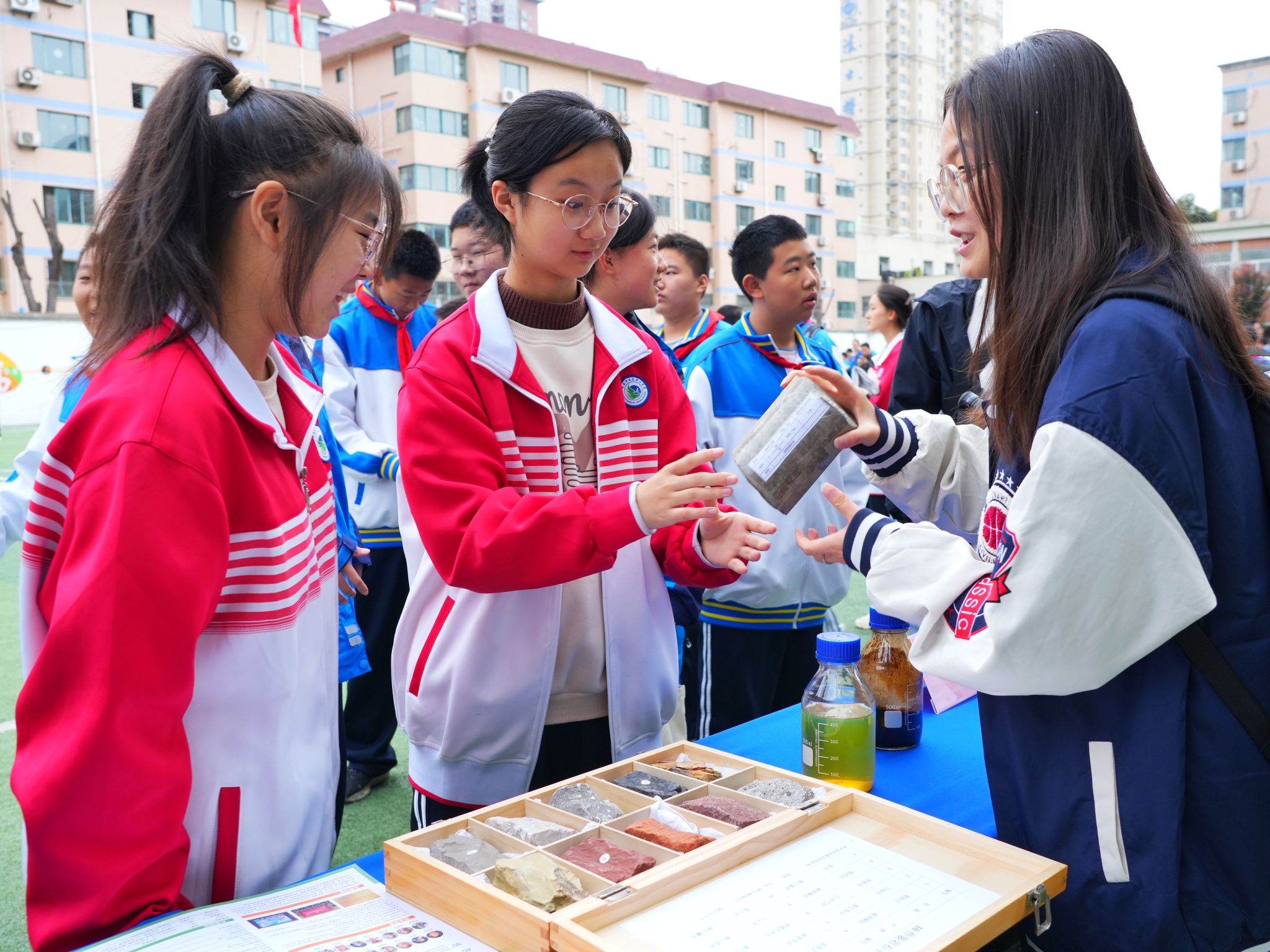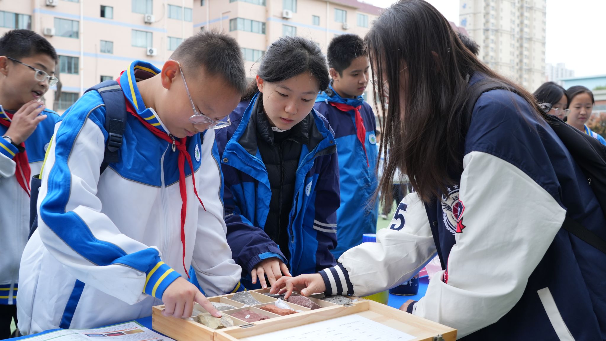 活动现场,科普志愿者正在向同学们讲解岩石标本