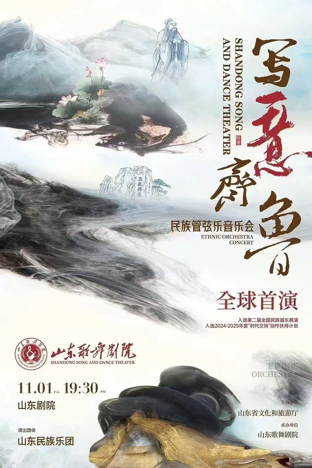 由山东省文化和旅游厅主办,山东省歌舞剧院演出的民族管弦乐音乐会《写意齐鲁》于11月1日晚在山东大剧院成功首演。该作品荣获中华人民共和国文化和旅游部2024-2025年度“时代交响”创作扶持计划,并入选第二届全国民族器乐展演活动。本场音乐会由国家一级指挥、中央民族乐团首席指挥、山东民族乐团艺术总监兼首席指挥、中国音乐学院民族乐团首席客座指挥、中国民族管弦乐学会指挥专业委员会常务副会长刘沙担任指挥,我系青年教师、国家一级演奏员周晓应山东省歌舞剧院邀请参与此次音乐会,担任乐团首席。
