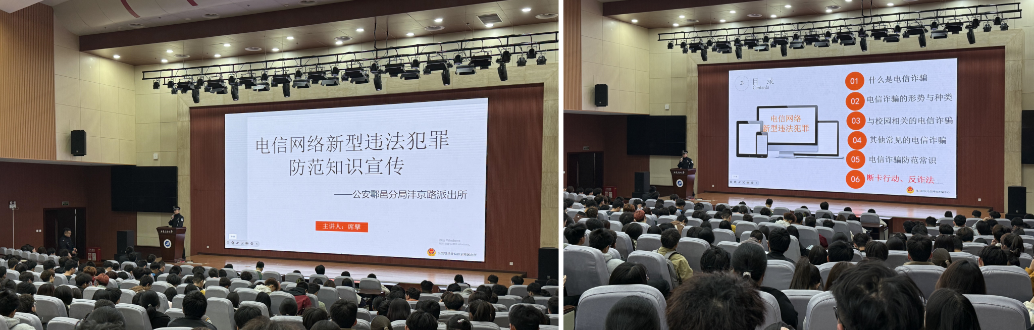 为进一步增强在校大学生的防骗意识,提升自我保护能力,11月6日下午,电子工程学院在鄠邑校区弘石报告厅举办了以“如何防范电信网络新型违法犯罪”为主题的专题讲座。此次讲座由鄠邑区沣京路派出所资深民警席擘担任主讲老师。2024级辅导员沈轩羽主持,2024级400余名本科生参加。