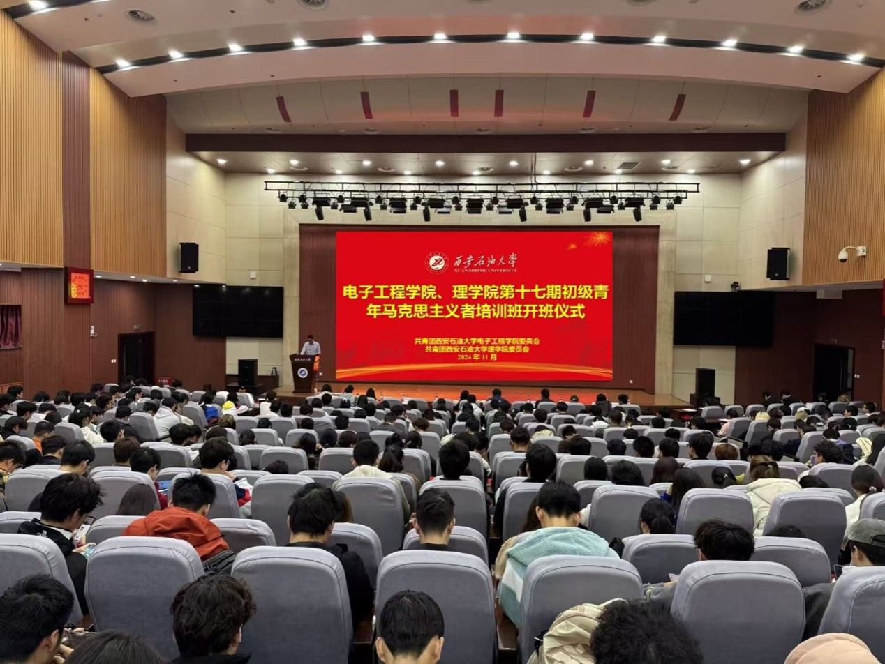 11月13日下午,电子工程学院、理学院联合举办的第十七期初级青年马克思主义者培训班开班仪式暨第一讲授课在鄠邑校区弘石报告厅开班。电子工程学院党委书记潘娜、党委副书记芮执根,理学院党委副书记杨富民、团委书记庞波,学院各团总支书记、副书记,青马班全体学员参加开班仪式。电子工程学院团委书记钱宇航主持仪式。