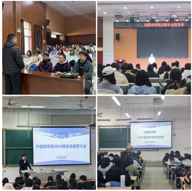 为进一步强化学生安全意识、防诈骗意识、自我保护意识,根据学校统一安排部署,外国语学院各年级于11月20日至28日分别在鄠邑校区博览楼A239、崇文楼118召开安全教育大会,会议由各年级辅导员主持。