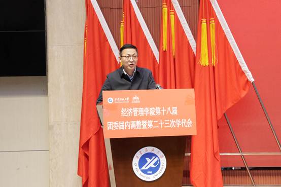 11月27日,共青团beat365官方网站经济管理学院第十八届委员会届内调整暨第二十三次学生代表大会在鄠邑校区学术报告厅顺利召开。校团委书记王刚、经济管理学院党委副书记杨生强、经济管理学院团委书记李博文、校团委干事李政、王泽文、学院各年级团总支书记、辅导员以及各兄弟院(系)学生会主席团代表、学院学生代表200余人参加了此次会议。