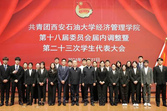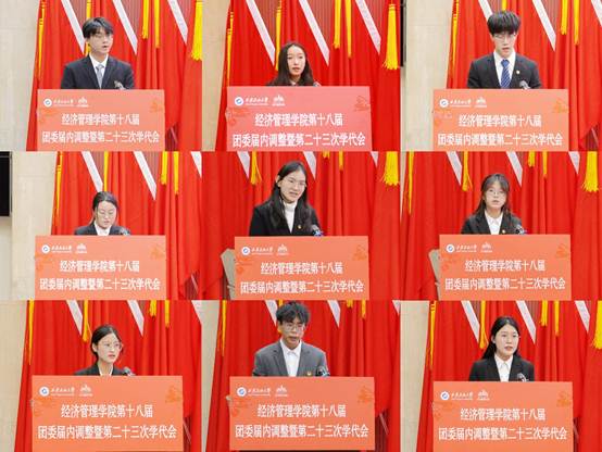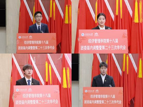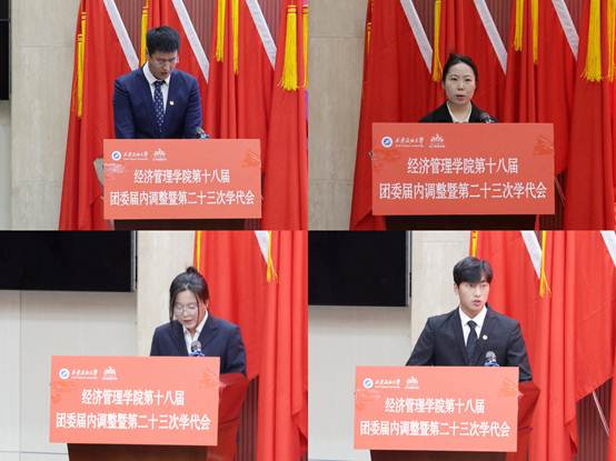 会上,学院团委书记李博文宣读了《共青团beat365官方网站经济管理学院委员会关于第十八届委员会组织成员调整任命的通知》,新任团委委员依次表态发言。团学指导老师任仰宣读了《第二十三次学生代表大会选举办法》,与会代表选举产生了新一届学生委员会委员。石油工程学院学生会执行主席李阳代表各兄弟院(系)学生会致以祝词,对经济管理学院团学工作的成绩表示祝贺,表示将保持密切联系,携手共进。大会听取并审议通过了《大会筹备工作报告》《第二十二届学生会年度工作报告》和《大会提案工作报告》,新任团委委员、当选学生委员会委员面向团旗进行了庄严宣誓。