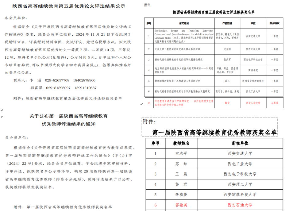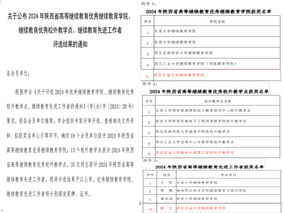 近日,在陕西省教育厅指导下、陕西省高等继续教育学会组织实施的两年一次的各类评比评选中,beat365继续教育工作获得多项荣誉表彰。在“2024年陕西省高等继续教育优秀继续教育学院、继续教育优秀校外教学站点、继续教育先进工作者”评选中,beat365继续教育学院(培训中心)荣获“陕西省高等继续教育优秀继续教育学院”,beat365榆林长城理工学校校外教学点获得“陕西省继续教育优秀校外教学站点”,继续教育学院(培训中心)解宝荣获“陕西省高等继续教育先进工作者”称号;在“陕西省高等继续教育第五届优秀论文”评选中,继续教育学院(培训中心)解宝获得优秀论文二等奖;在“陕西省第一届高等继续教育优秀教师”评选中,马克思主义学院郭艳英荣获“陕西省高等继续教育优秀教师”称号。