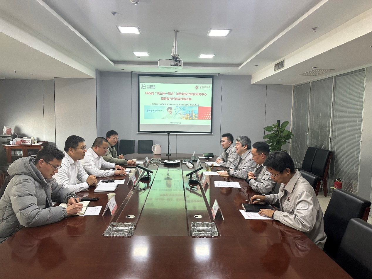 2024年12月25日,石油工程学院院长黄海、副院长窦亮彬一行赴中石化绿源地热能(陕西)开发有限公司走访交流,就促进联合建设的陕西省“四主体一联合”地热能校企联合研究中心发展及校企双方产学研合作展开深入座谈。中石化绿源地热能(陕西)开发有限公司执行董事兼总经理刘斌、副总经理邹彦荣出席座谈会。
