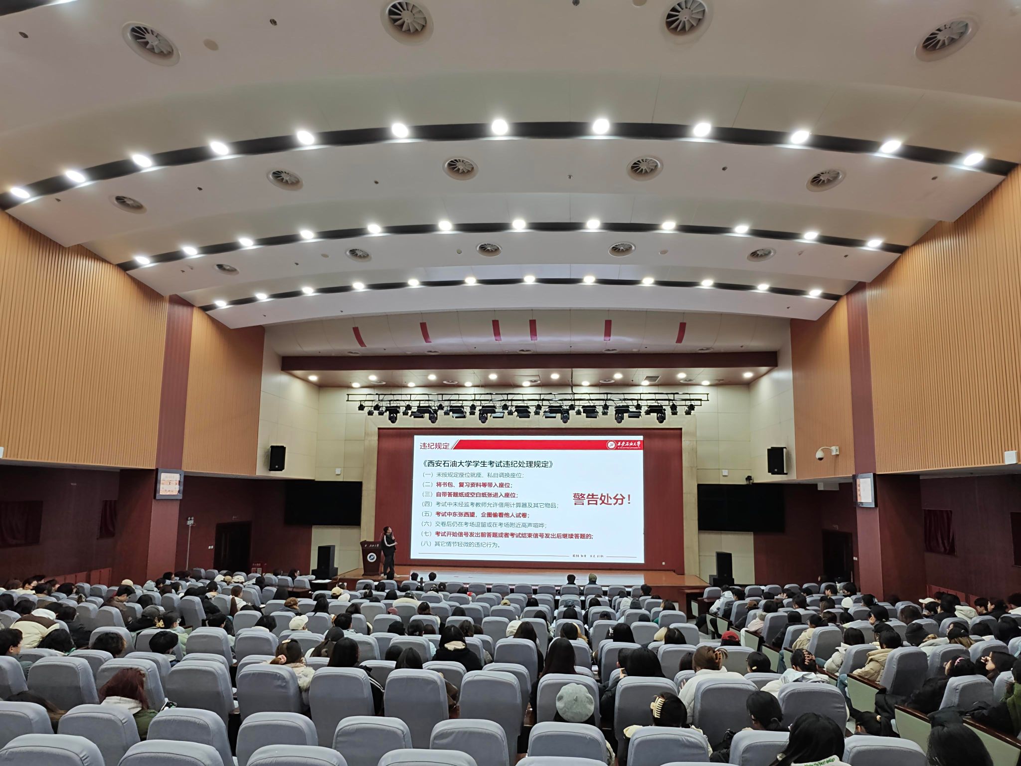 为进一步强化学生的诚信意识,严肃考风考纪,同时做好学生节前假前教育,12月30日上午,人文学院在鄠邑校区弘石学术报告厅召开2023级考试诚信教育暨节前假前年级大会,2023级辅导员王凯杰主持,2023级全体本科生参会。