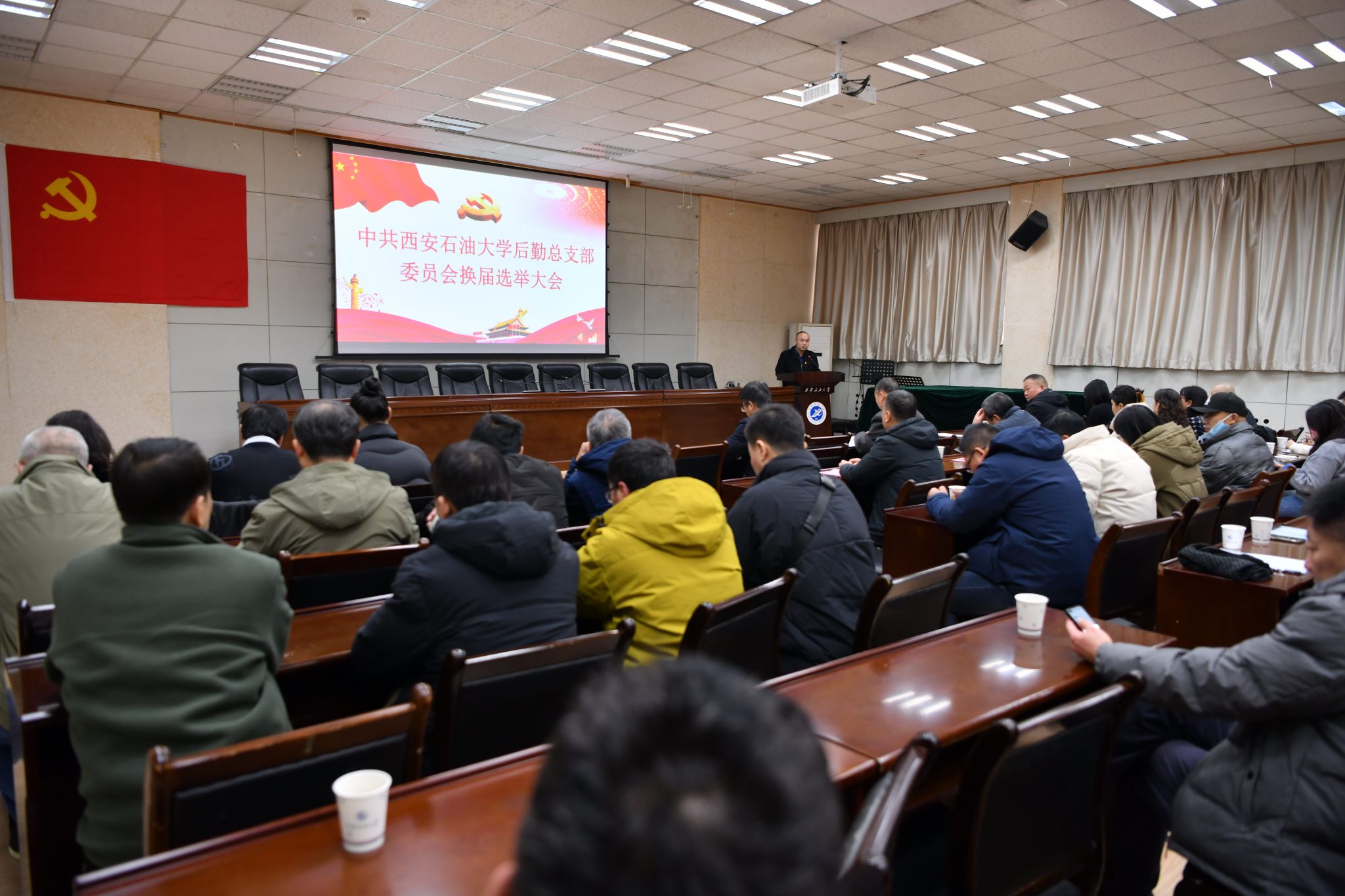 1月8日上午,中共beat365官方网站后勤总支部委员会换届选举大会在雁塔校区西阶会议中心第三会议室隆重召开。校党委委员、副校长张骁勇出席大会并讲话。后勤处全体党员同志参加大会,并邀请民主党派代表、群众代表列席参加。大会由后勤处处长刘笛主持。大会在庄严的国歌声中拉开帷幕。