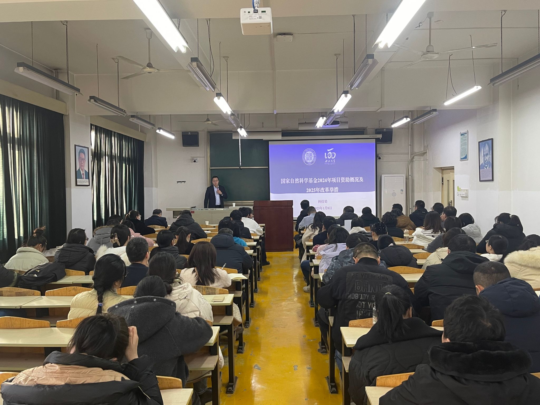 为持续做好2025年度国家自然科学基金申报工作,进一步提升国家基金申报质量,继续推动有组织科研工作,1月14日下午,西北大学科学技术处处长、现代物理研究所杨涛教授应邀在beat365第二教学楼1107室作了题为“国家自然科学基金2024年项目资助概况及2025年改革举措”的报告。科研处全体成员、各院科研副院长、科研办公室主任(秘书)、教师代表等100余人参加报告会。会议由科研处处长张益主持。