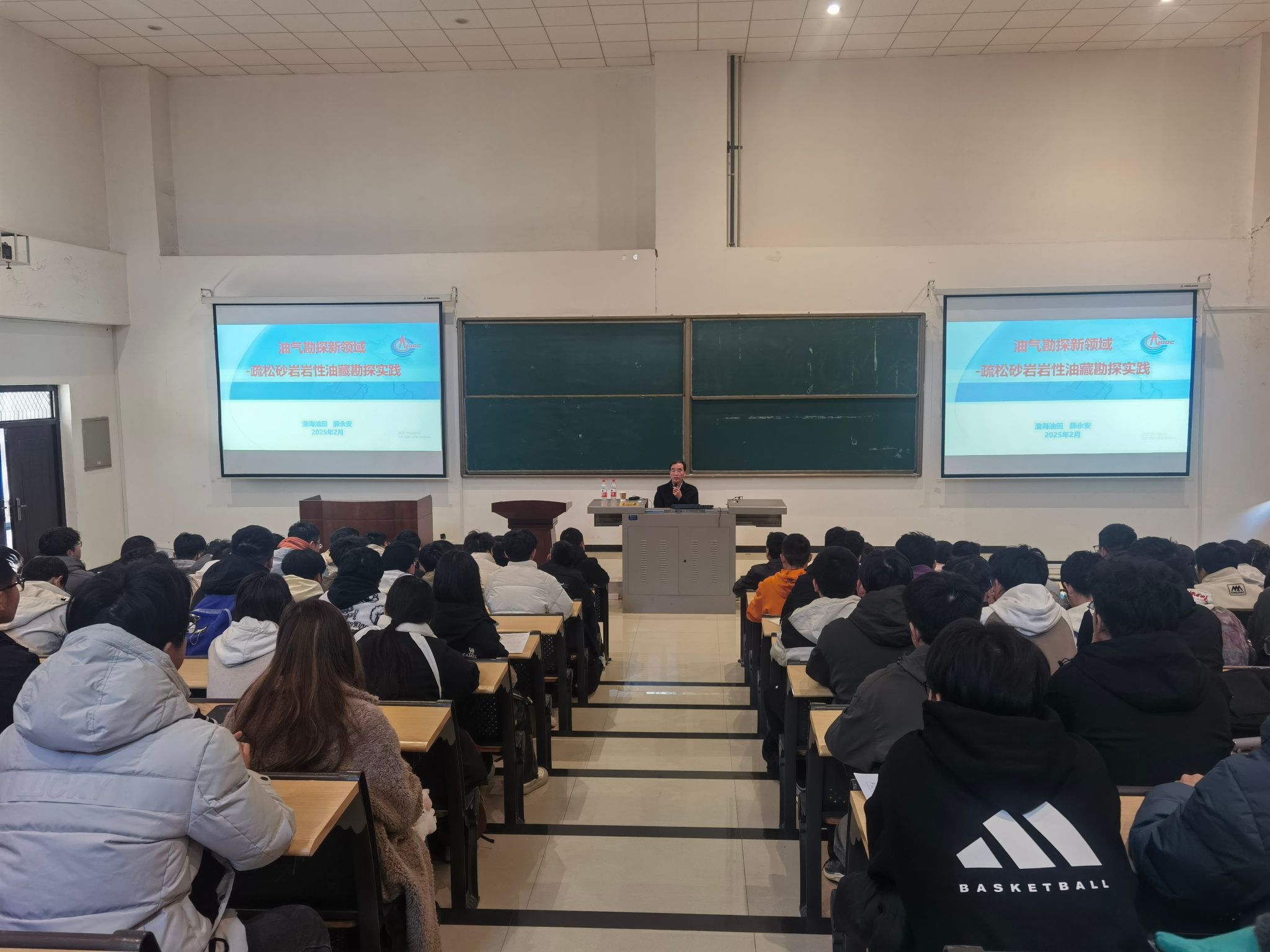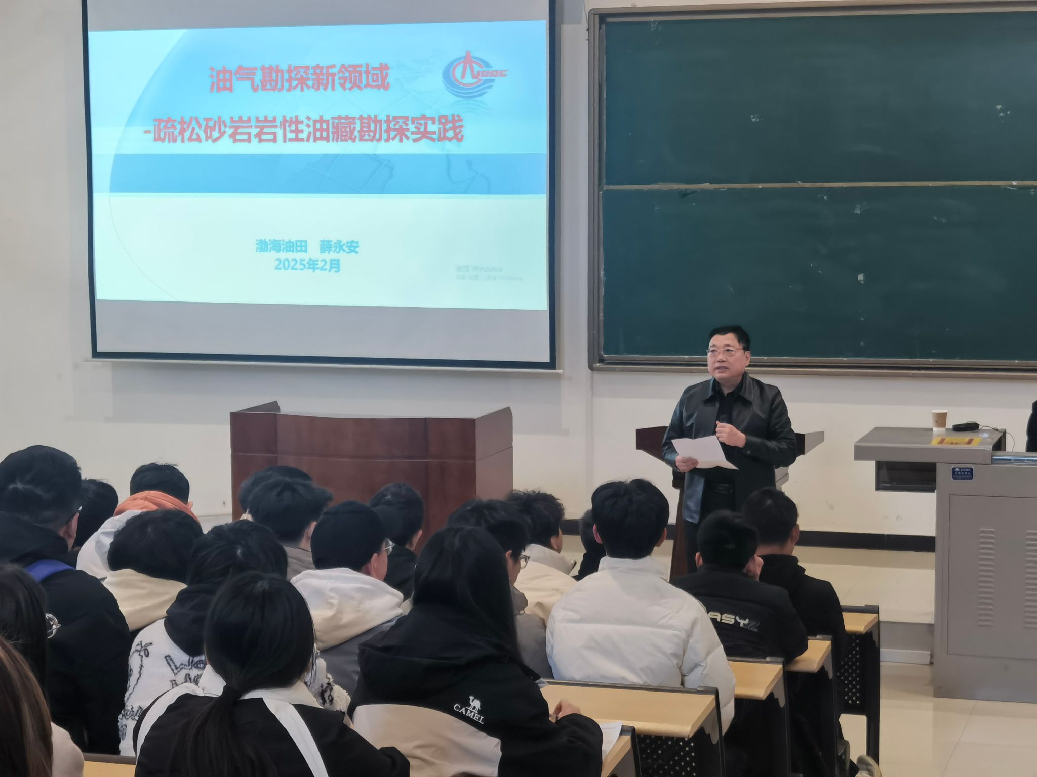 薛永安教授首先分享了自己近40年的油气地质科研经验,而后以渤海油田源外构造空白区新生界疏松砂岩岩性油藏勘探重大突破及系列理论创新为切入点,鼓励同学们在学习中秉承脚踏实地、大胆假设、小心求证的原则,守正创新,努力成为未来我国能源领域顶得上、接得住的中坚力量。讲座现场气氛热烈。