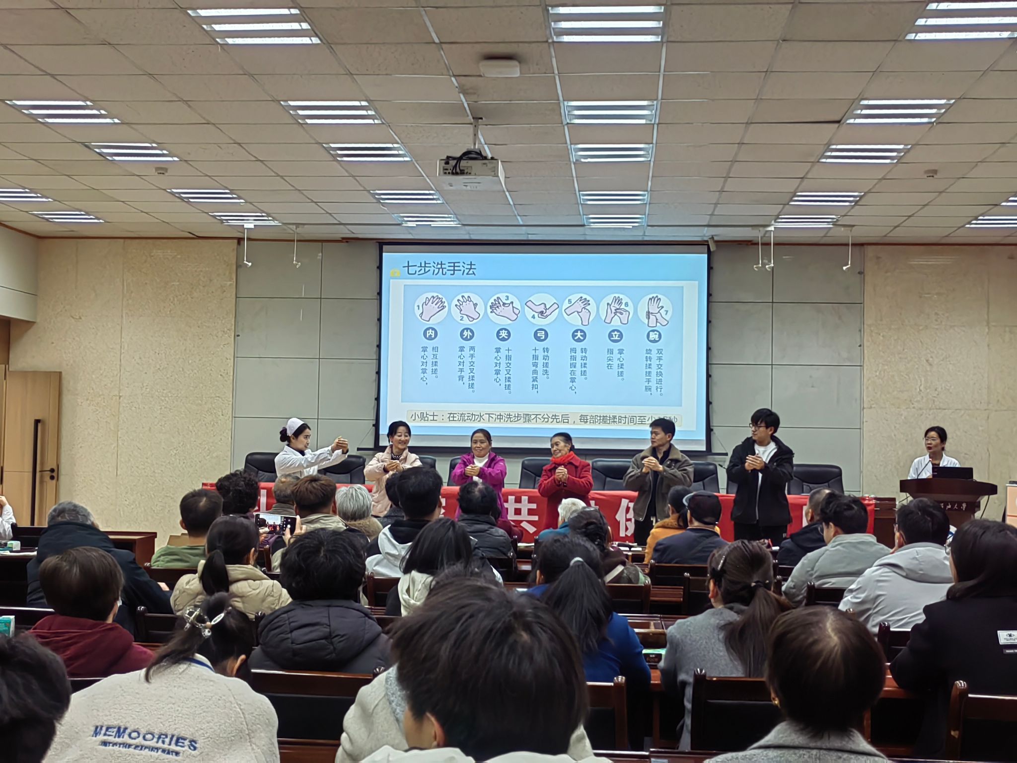 本次讲座由校医院经验丰富的主治医师洪艳萍主讲。讲座中,洪医生结合春季传染病的流行特点,以通俗易懂的语言,详细讲解了流感、新冠、手足口、水痘、麻疹、诺如病毒感染等常见传染病的发病症状、传播途径、预防措施等知识。同时,她还强调了保持良好个人卫生习惯、加强体育锻炼、及时接种疫苗等预防手段的重要性,并针对师生们提出的疑问进行了耐心解答。最后,还通过现场分解演示“七步洗手法”,细致讲解每一步骤的要领,大家积极尝试,并通过现场互动来强化记忆,现场氛围浓厚,有效提升了师生日常防护意识及操作的规范性。