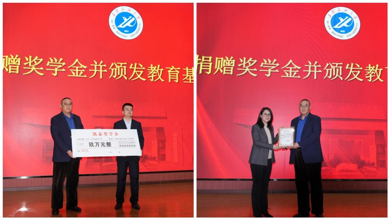 会前,赵健副校长与吴立中董事长进行了深入交流,对企业近年来取得的蓬勃发展表示祝贺,对企业支持教育事业发展的善举表示感谢。双方表示要进一步巩固校企友谊,加强沟通与合作,推动校企双方共同发展。仪式开始,凯泰石油机械有限公司董事长吴立中向学校基金会捐赠了教育基金,潘娜向吴立中颁发了教育基金捐赠证书。