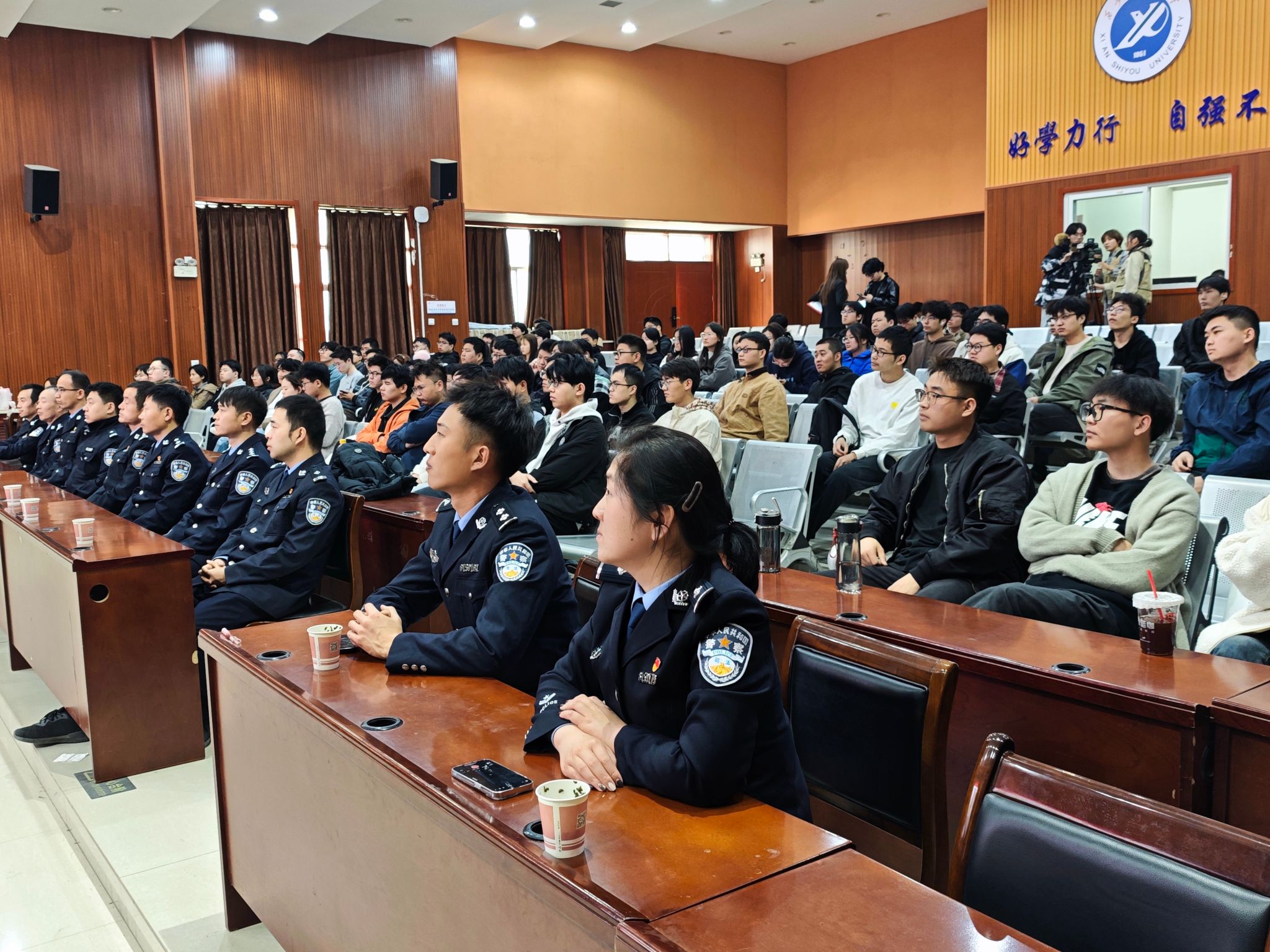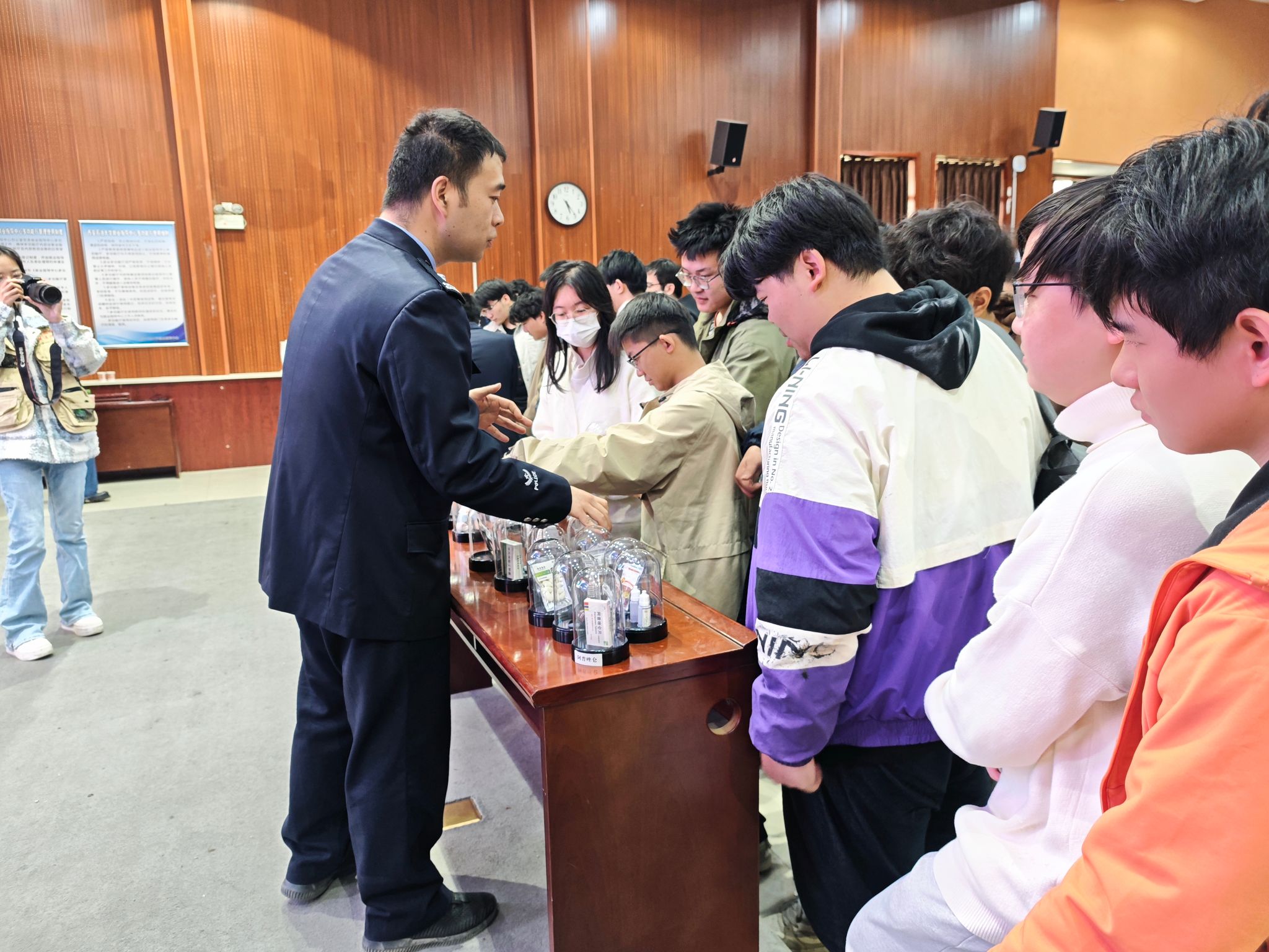 讲座临近结束时,在西安市强制隔离戒毒所与西安市公安局鄠邑分局禁毒大队警官们的引领与解说下,同学们有序地围拢至仿真毒品模型展示区,近距离了解到毒品的常见形态及其伪装形式。通过这一互动环节,同学们不仅亲眼目睹了毒品的多变面貌,还借助毒品宣传板的丰富内容,进一步深化了对禁毒知识的理解,增强了自我防护的警觉性。