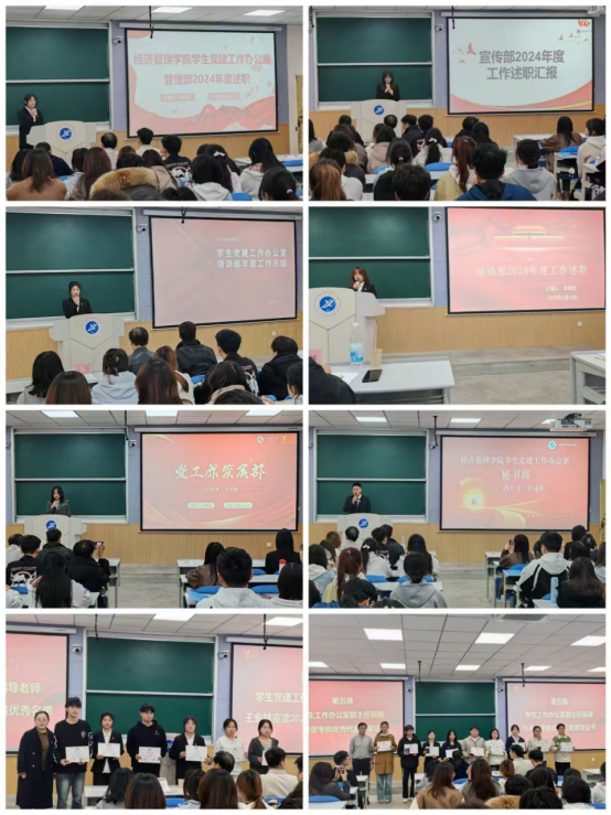 会上,学生党建工作办公室主任王佳妮及六个部门负责人分别从履行岗位工作责任、落实党建工作任务、部门工作特色、存在问题与改进思路举措等方面进行了述职汇报。根据过去一年的工作表现,学院党委对党工办全体成员进行了考核与表彰,为考核优秀成员颁发了荣誉证书并合影留念。