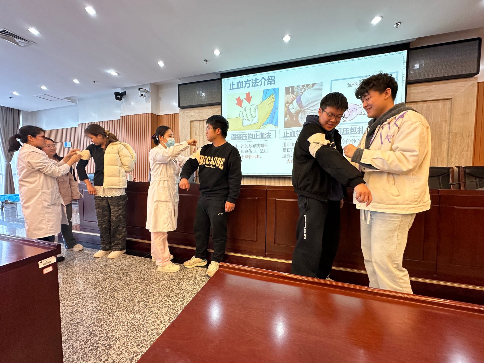 培训采用理论讲解与现场演练相结合的方式,培训内容涵盖了心肺复苏和AED的使用、气道异物梗阻的应急处理、外伤止血包扎技术、烧烫伤应急处理、溺水应急处理等六项实用急救技能。宋彦霞和解姣两位讲师凭借丰富的临床经验和教学经验,用通俗易懂的语言,以及标准的动作示范,深入浅出地讲解了各项急救技能的理论知识和操作要点。为了让同学们更好地掌握急救技能,培训还设置了模拟演练环节,同学们在讲师的指导下,亲身体验了心肺复苏、AED使用、止血包扎等操作。