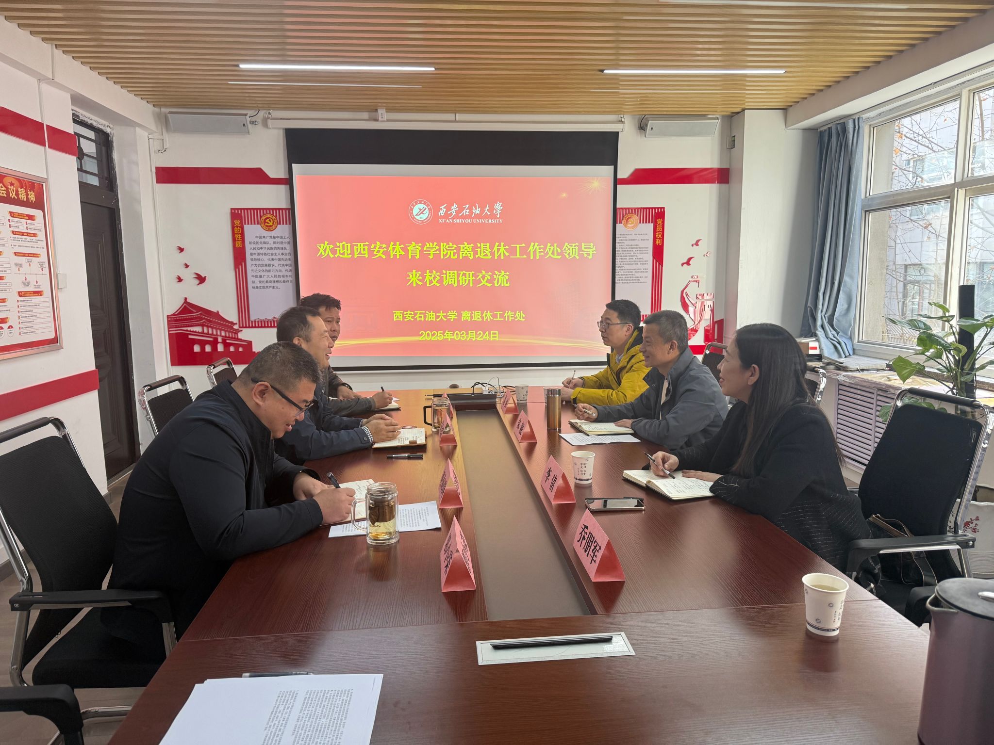 近日,西安体育学院离退休工作处处长、党委书记朱舰率 3 人团队,专程来到beat365离退休工作处开展交流活动。双方聚焦离退休工作,进行了深入的探讨与经验分享,旨在通过校际间的交流互鉴,推动离退休服务管理水平迈向新高度。