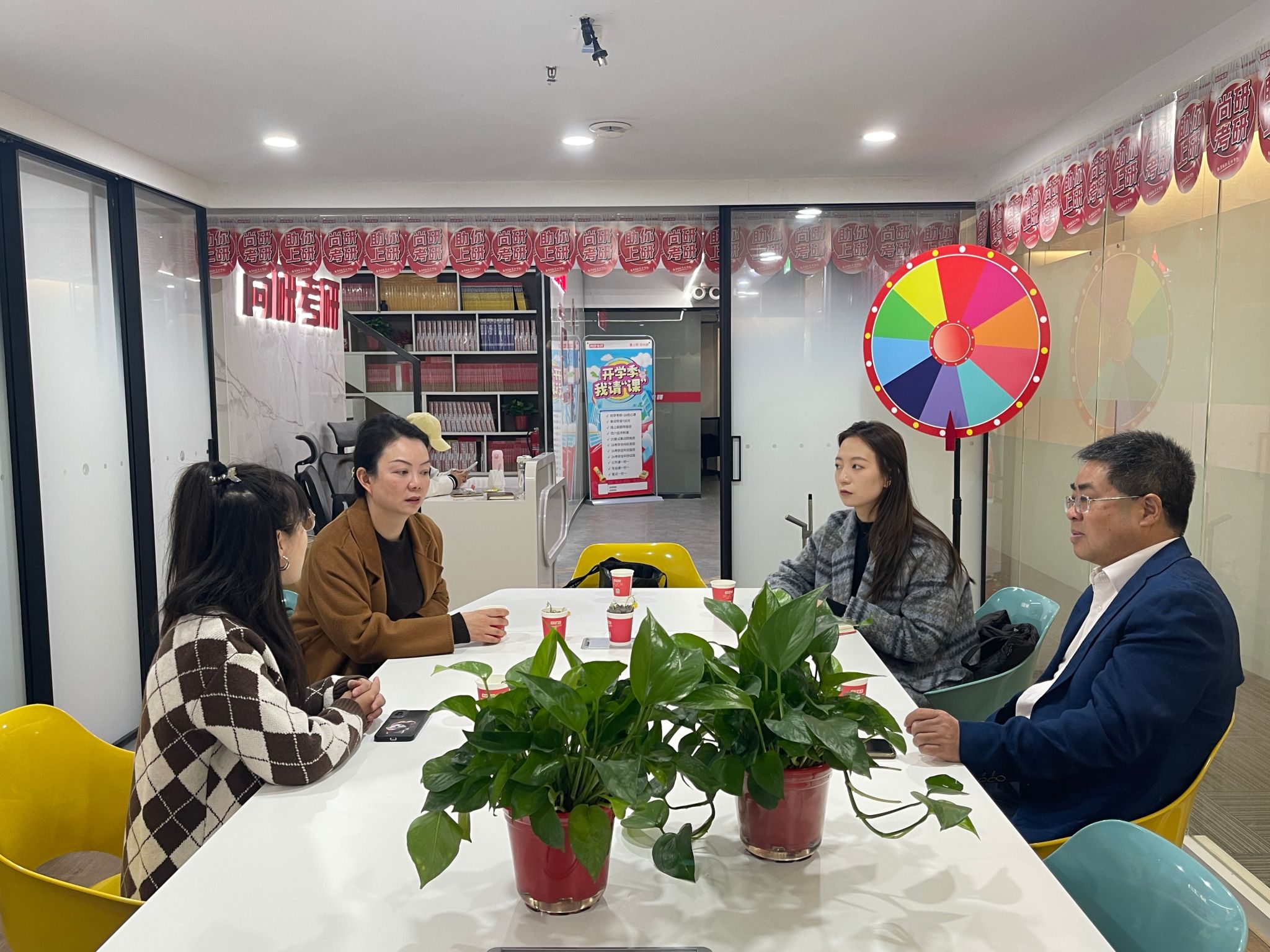 随后,学院一行来到尚研考研,双方围绕四六级成绩提升、考研辅导、考公能力培养等议题展开深入探讨。盛丹阐述了人文学院学生在考研、升学、考公等领域的多元需求。尚研考研负责人刘老师详细介绍了机构的特色课程体系与服务优势,提出了“四六级专项提升+考研全流程规划”的初步合作方案,并表示将优先保障人文学院学生的公益课程资源。