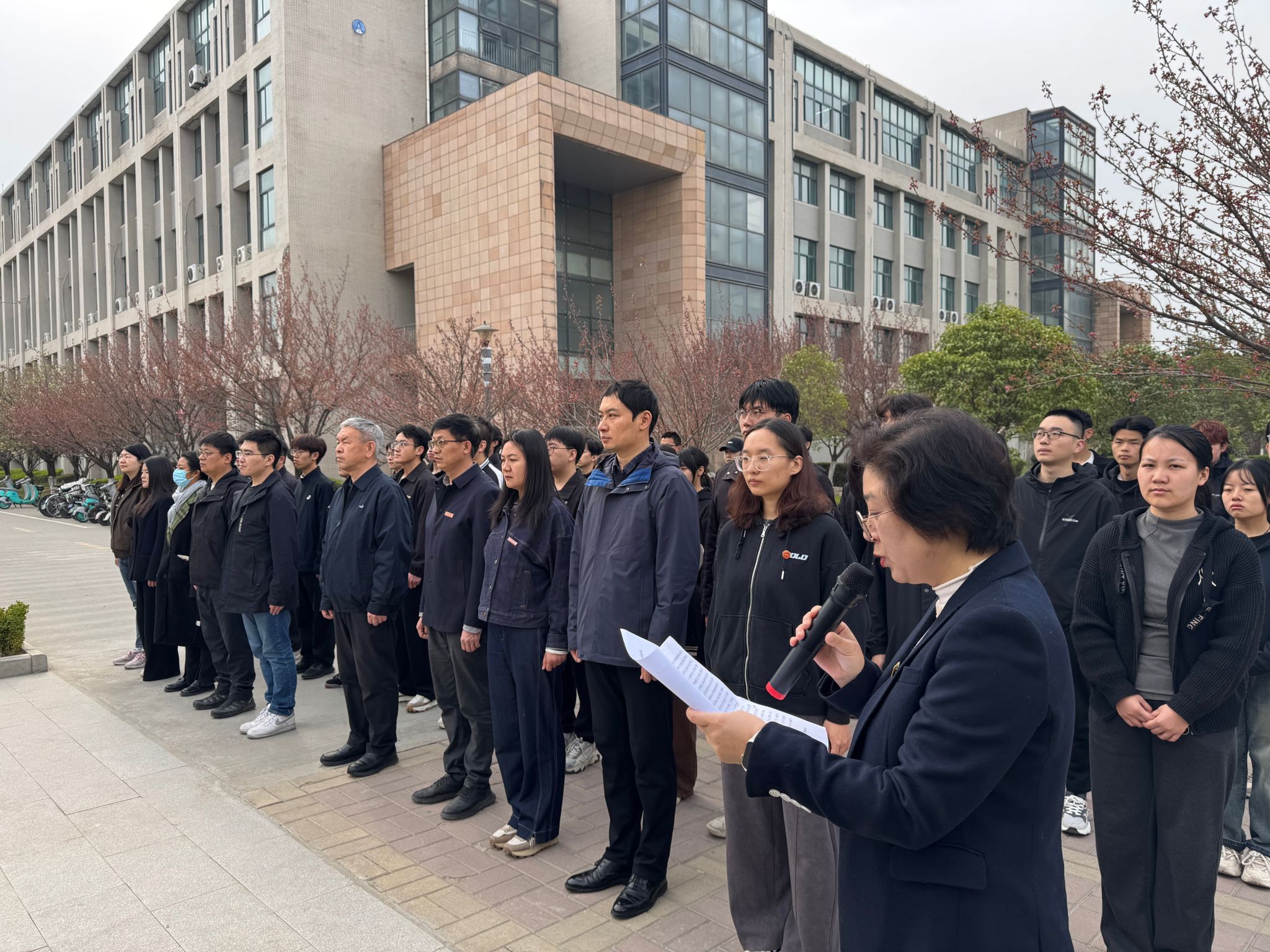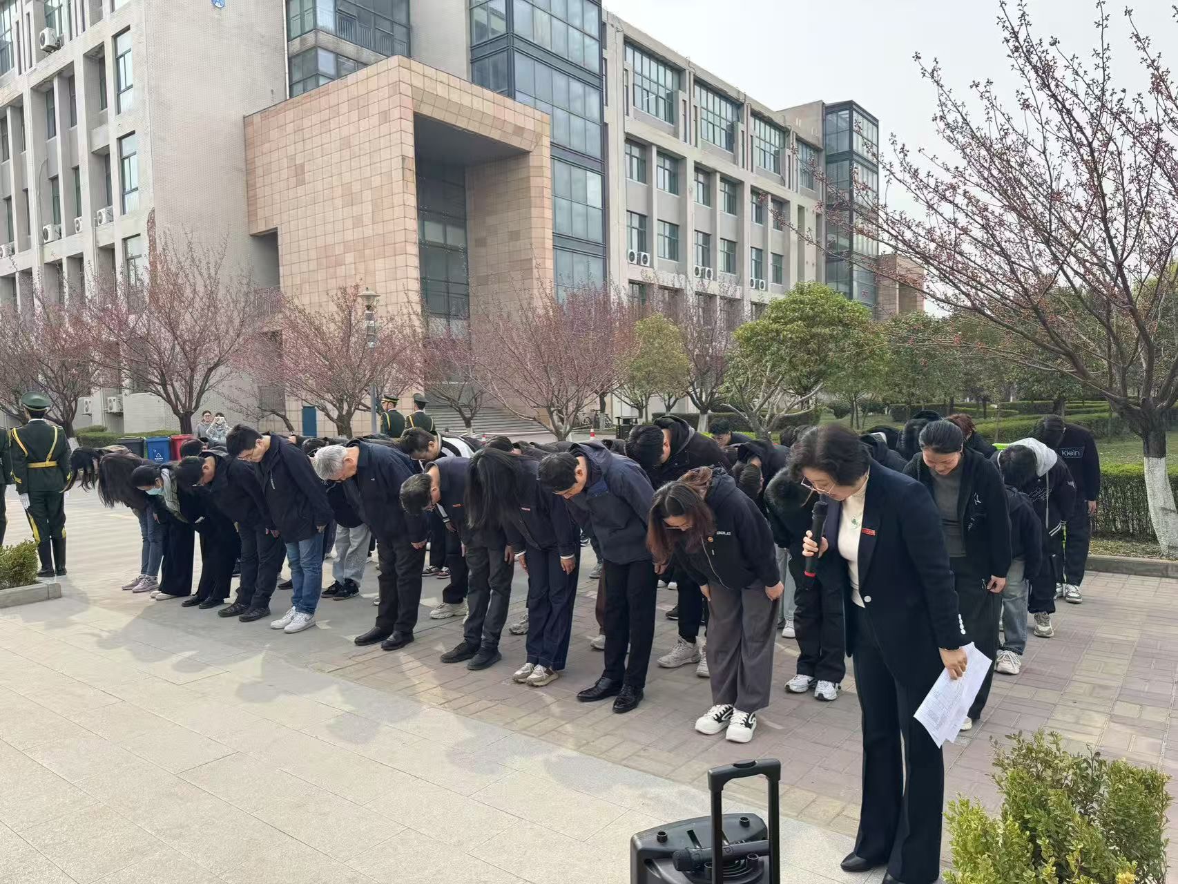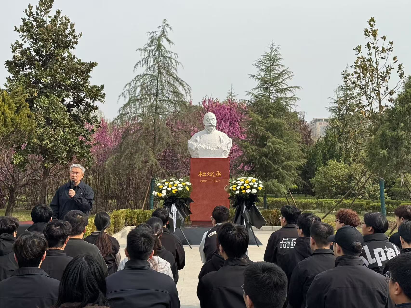 在庄严肃静的氛围中,全体师生默哀一分钟,向杜斌丞先生致以最深切的哀思。默哀结束后,全体师生面向杜斌丞烈士雕像三鞠躬,表达了对杜斌丞烈士的崇高敬意。