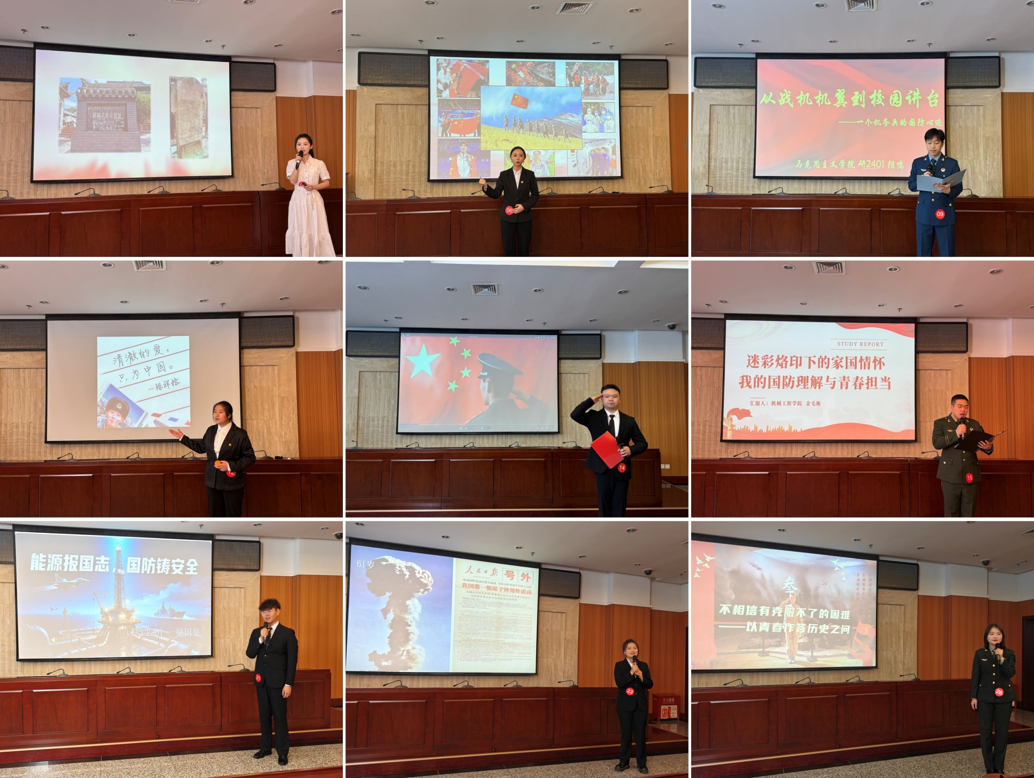 比赛现场气氛热烈而庄重,参赛选手们身着正装,精神饱满,以激昂的文字、真挚的情感和生动的表达,围绕“爱我国防”这一主题,从不同角度、不同层面阐述了国防的重要性以及自己对国防事业的理解和感悟。地球科学与工程学院韩磊欢同学从历史的角度出发,讲述了革命先烈们为了国家独立和民族解放,浴血奋战、保家卫国的英勇事迹,让在场听众深刻感受到了国防事业的伟大与艰辛;化学化工学院徐荣川同学结合当下国际形势,分析了我国国防建设面临的挑战和机遇,呼吁同学们树立忧患意识,努力学习科学文化知识,为国防事业贡献自己的力量;人文学院师央依同学以身边人、身边事为切入点,讲述了普通人在国防建设中的责任和担当,引发了在场听众的强烈共鸣……27组选手演讲主题鲜明、内容丰富、形式多样,展现了当代青年学子积极向上、朝气蓬勃、奋发有为的精神风貌。