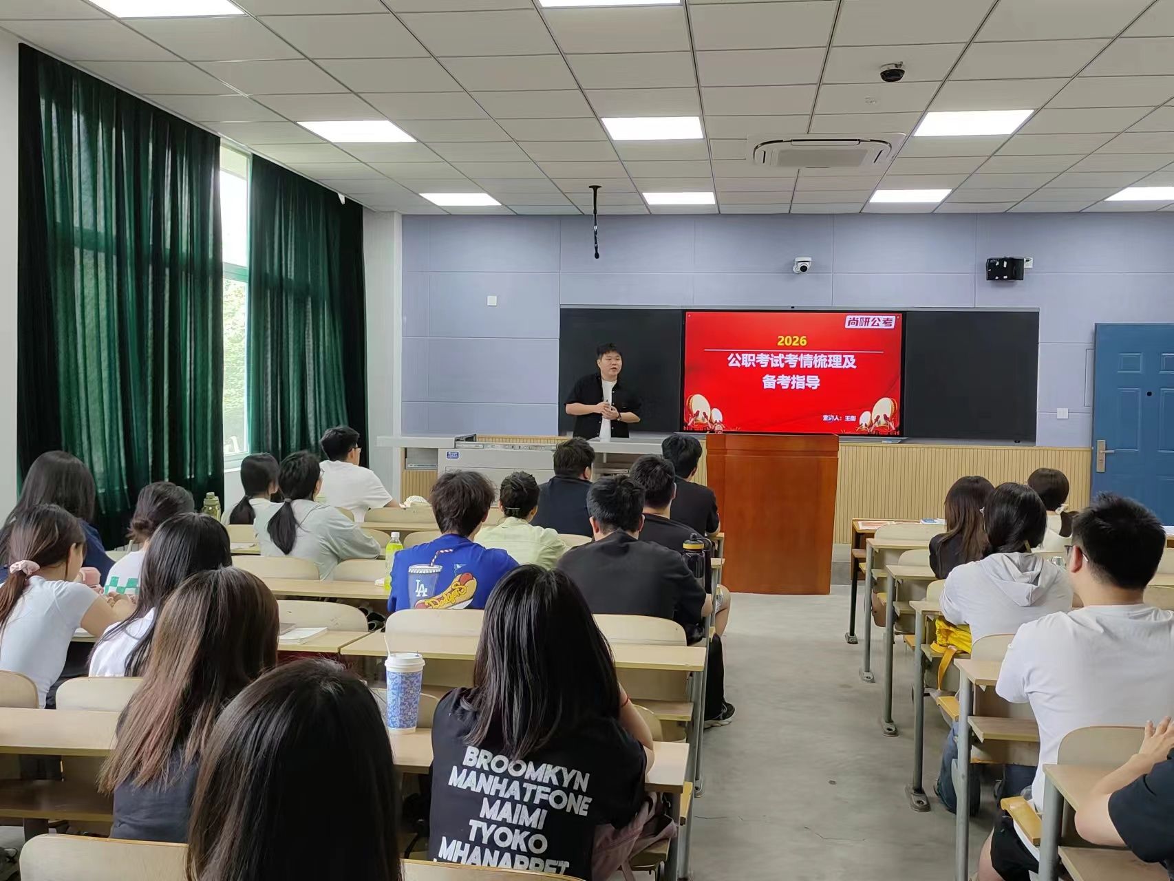 为助力2026届毕业生科学备战公务员考试,精准把握考情趋势,提升应试能力。5月7日下午,人文学院在博览楼A105举办“2026年公职考试考情梳理及备考指导”专题讲座。本次活动由人文学院联合尚研公考共同发起,人文学院党委副书记盛丹、尚研公考名师王蘅、2021级辅导员张馨元出席活动,人文学院与经管学院意向考公学生到场参与。