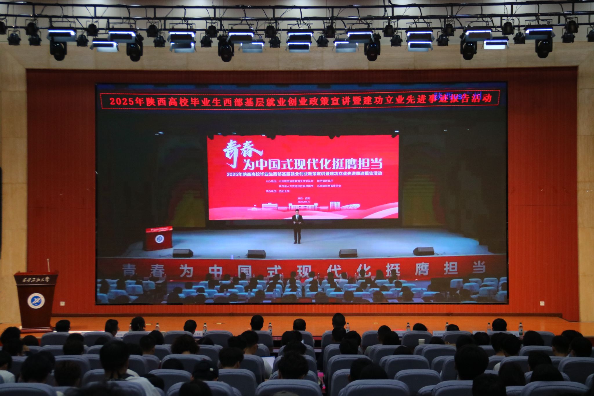 报告会上,贵州省德江县潮砥镇党委书记陈吴,中国铁路兰州局集团有限公司银川工务段钢轨探伤车间技术员吕叶,西安心化未来化学科技有限公司总经理林青青,咸阳市泾阳县桥底中心卫生院内儿科副科长薛凯,榆林市第二十四幼儿园教师韩婵等5名报告团成员代表生动讲述了他们响应国家号召,扎根西部基层、矢志奋斗奉献的感人经历和成长感悟。报告团成员服务西部、建功基层的奋斗故事,深深触动了现场的学子们,同学们凝神聆听,深受启发。