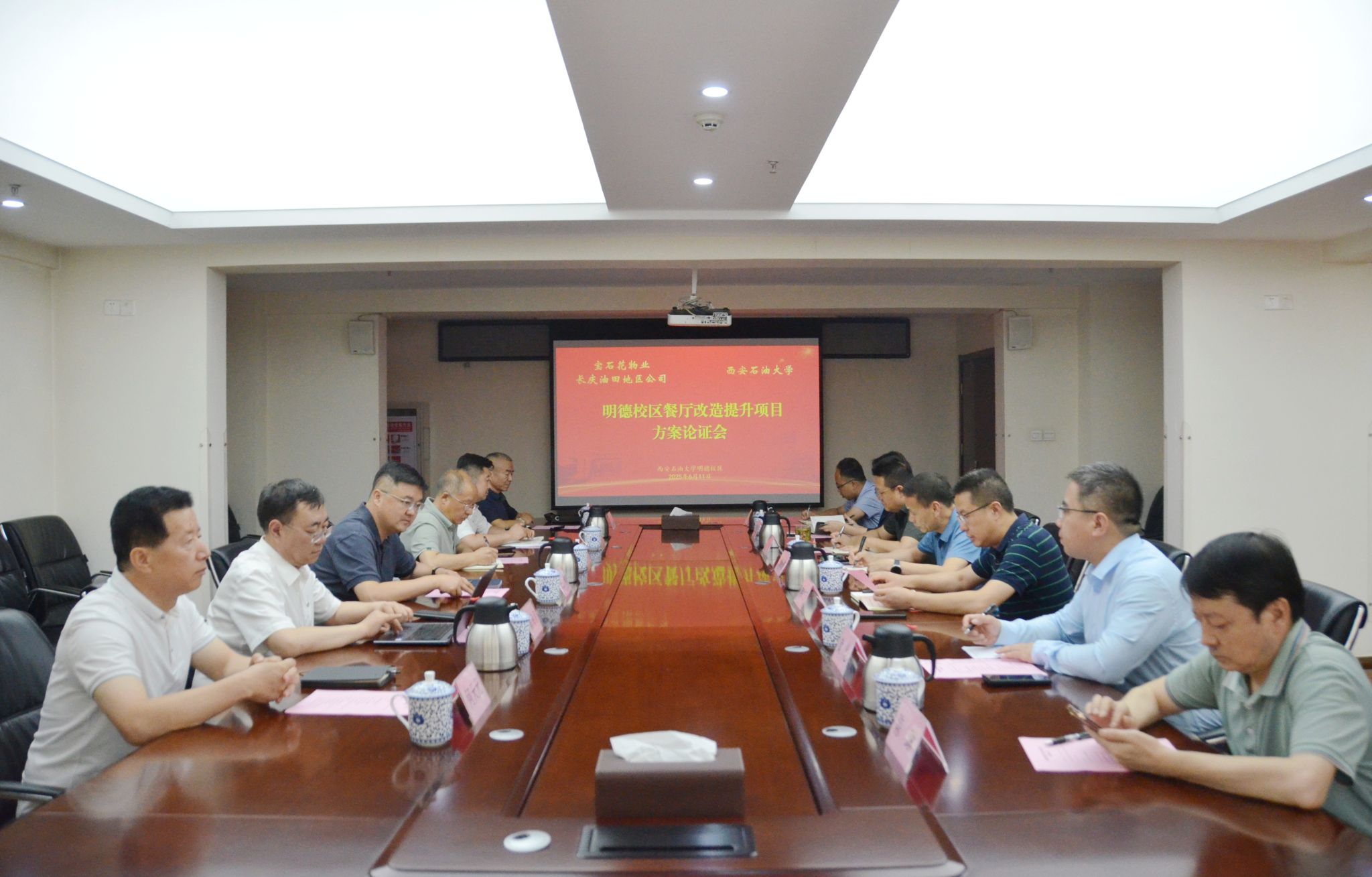 6月11日下午,学校与宝石花物业长庆油田地区公司在明德校区召开“明德校区餐厅改造提升项目”方案论证会,双方围绕项目设计方案进行深入研讨,进一步优化功能布局。宝石花物业长庆油田地区公司市场部总监王恒、运营部工程管理主任李建宁等6人,beat365研究生工作部、后勤处、国际教育学院及继续教育学院负责人参加会议。会议由继续教育学院(培训中心)院长(主任)林红先主持。