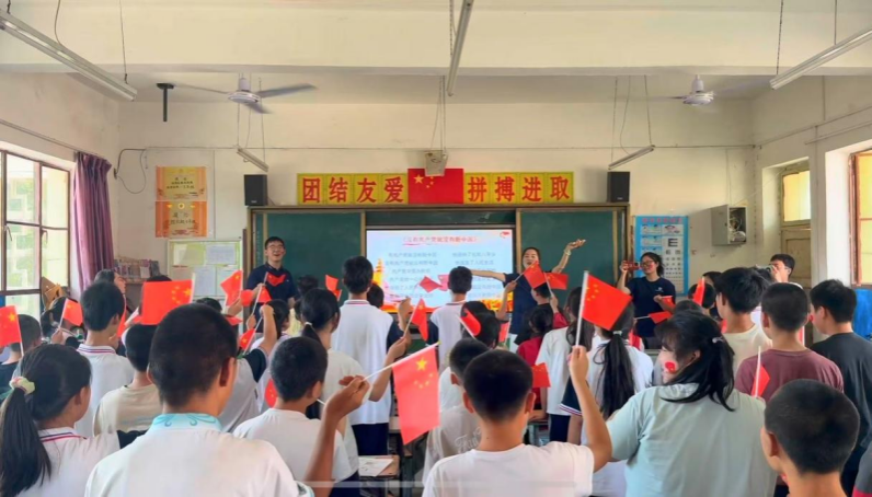 实践团成员以西安事变为切入点,为4所学校近200名中小学生讲授了一堂生动的爱国主义教育课。课堂创新采用“双师教学+多媒体沉浸”模式,主讲教师通过展示历史影像资料,生动还原西安事变全过程;课程还穿插了即时问答环节。在课堂最后,辅助教师组织学生集体合唱红色歌曲《没有共产党就没有新中国》,深化了孩子们的爱国情感。