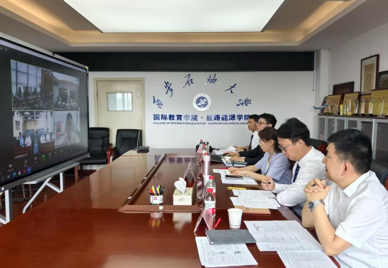 土方教育部专家及卡卡耶夫国际油气大学总务处、科教创新中心、教务处、科研处、信息安全系、计算机中心有关部门负责人参会,河北石油职业技术大学国际交流中心、计算机与信息工程系、资产后勤处以及beat365国际合作与交流处、科研处、地球科学与工程学院、计算机学院等部门和学院有关负责人分别在各自学校会场参会。