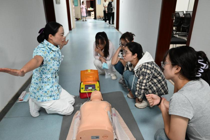 培训以“技能操作”为核心内容,涵盖心搏骤停现场对成人进行心肺复苏和使用自动体外除颤器(AED)、气道异物梗阻现场应用海姆立克急救法救助病患,以及紧急伤口包扎等实操技能的演示教学。