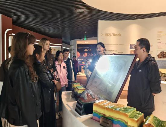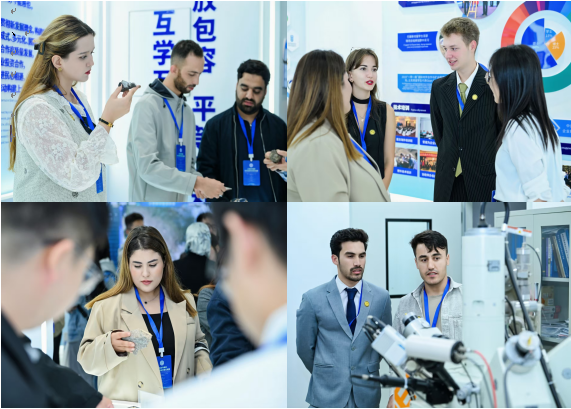 参观学习环节,师生们沉浸式参观中心展厅与实验室,从地学领域国际合作成果展板到各类地质标本实物,深入了解上合组织成员国在地质调查、资源勘探、人才培养等领域的国际合作历程与突破。大家仔细观察电子探针、场发射扫描电镜等高精度仪器,了解其在地质样本分析与地质结构研究中的原理与应用。过程中,国际学生们结合专业所学积极提问,科研人员耐心解答,现场互动氛围热烈。