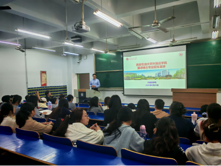 宣讲过程中,团队重点阐述beat365MTI专业的人才培养目标——紧密对接能源领域国际化发展、区域经济社会发展需求,培养具备国际视野、创新思维与思辨能力的高层次、应用型、专业化笔译人才。邓林详细介绍了三大特色研究方向的培养重点,同时展示了专业的硬件支撑实力,包括计算机辅助翻译实验室、人工智能翻译平台及在线智能翻译管理平台的建设与应用情况,让学子直观感受专业的技术赋能优势。陈柯深入介绍了学位点的师资力量以及学位点“石油石化”特色课程体系内容,beat365MTI课程主动适应数字智能时代发展趋势,坚持翻译技术赋能,注重学生跨学科知识储备与综合能力的培养,力求通过系统化培育,切实提升学生的专业竞争力与实践应用能力。最后,邓林就2026年beat365MTI硕士研究生招生计划、近年报考人数变化及录取分数线等关键信息进行详细说明,为有意向报考的学子提供精准参考。