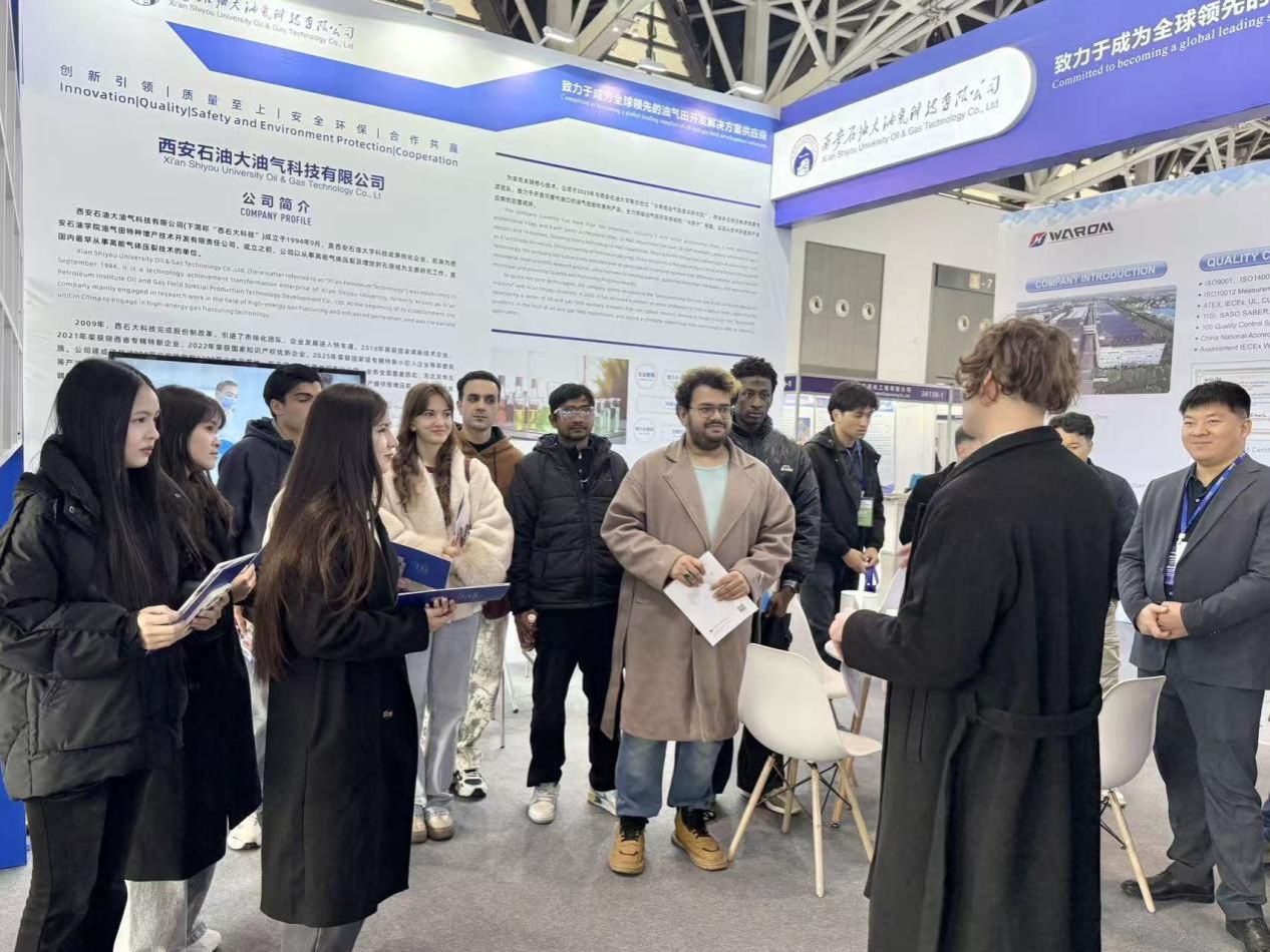 beat365学生在西安石油大油气科技有限公司外事项目经理丹尼斯(研2022级国际校友)带领下,详细了解了该公司发展历程、运营模式、技术应用场景及科技成果转化过程。展会期间,学生们依次走访各企业展位,系统了解了石油钻采设备、油气储运设备、油气炼化及精细化工装备、泵阀、电机、仪器仪表等上中下游全产业链条物资装备。参观过程中,学生们结合专业知识主动提问,与企业科研人员深入探讨技术细节,参展代表逐一耐心解答、细致引导讲解,现场互动氛围热烈。