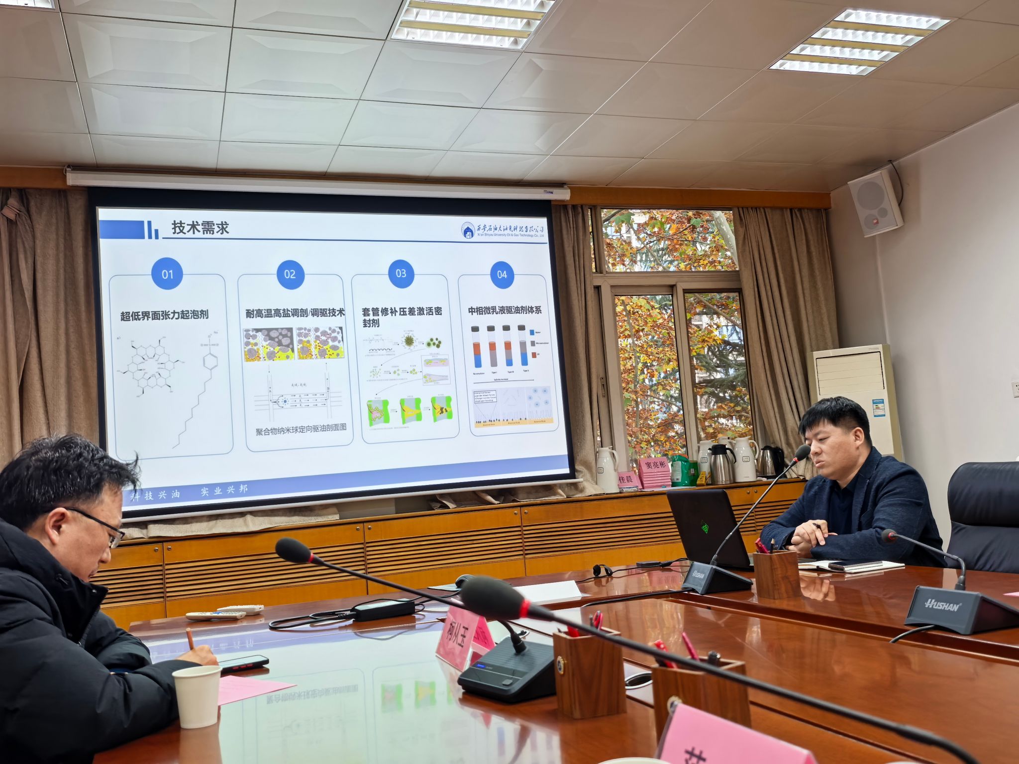 会上,李婷介绍了公司的基本情况,黄兆丰发布了公司的技术需求。柯从玉、陈世军分别以“中相微乳液驱油剂筛选优化及性能评价”“高温高盐油藏调剖堵水技术”“长庆油田低渗/超低渗油藏超低界面张力起泡剂”为题对公司的技术需求进行了揭榜汇报。随后校企双方就技术需求和研发方案细节进行了深入沟通交流。