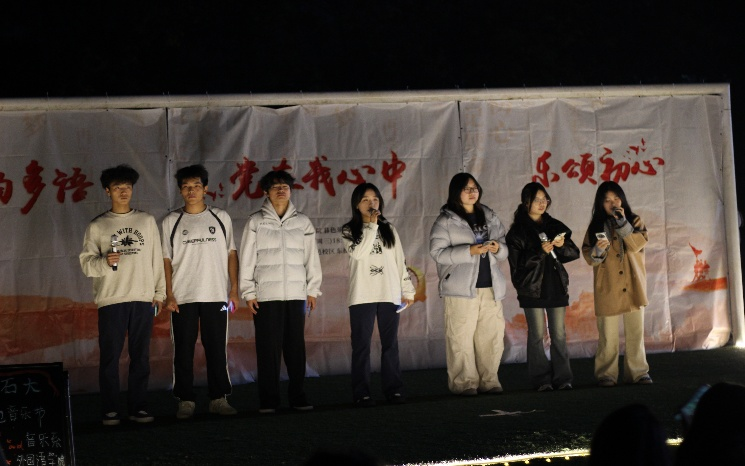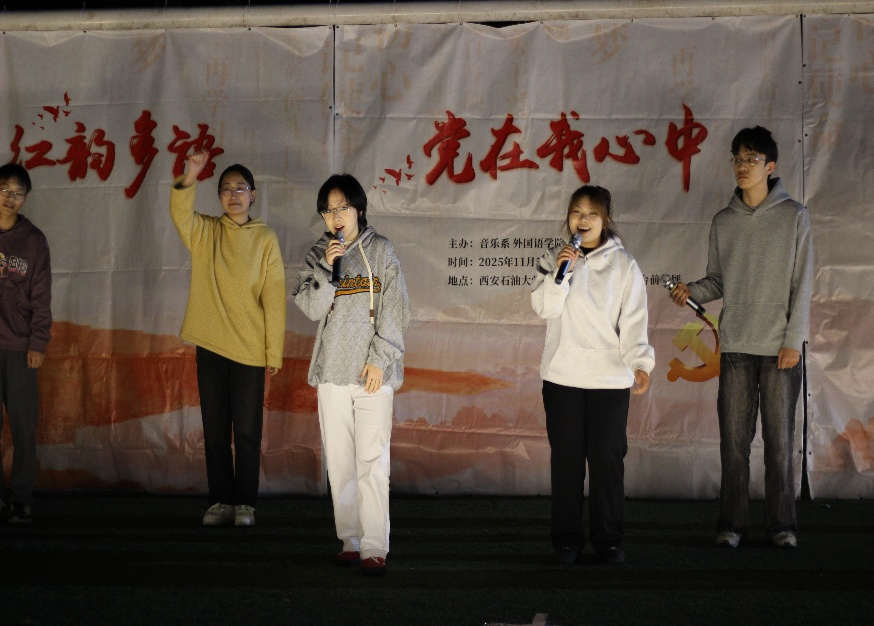 暮色降临,草坪上荧光点点,红色主题装饰与青春笑脸相映成趣,营造出庄重而热烈的氛围。音乐节在古筝弹奏《盛世国乐》中拉开序幕,优美的旋律引发全场共鸣,师生们认真聆听沉醉其中,爱国之情油然而生。随后,各学子带来《我爱你中国》《我和我的祖国》等经典红色歌曲,以及温情歌曲《听妈妈的话》和《如愿》,用激昂的歌声、深情的演绎,诉说对党的无限热爱与忠诚。《唱支山歌给党听》更是点燃全场热情,红色歌谣婉转动人,多样的表演形式让红色文化焕发出青春活力。