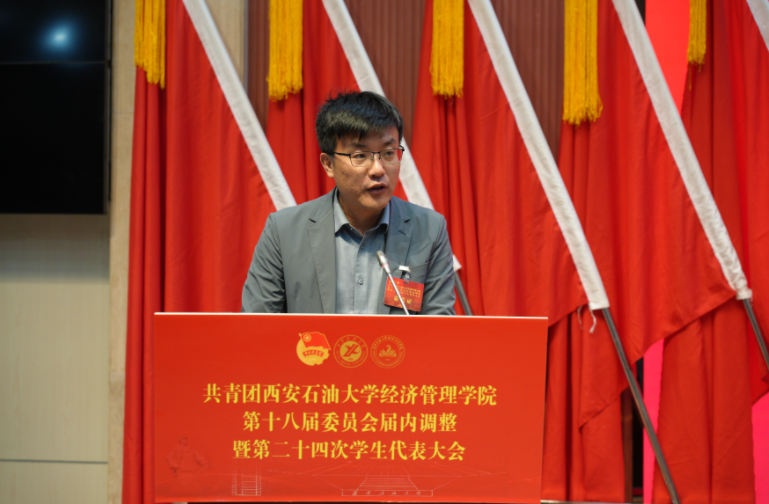 校团委书记王刚致词,他代表校团委、校学生会和研究生会向本次大会的胜利召开表示祝贺,肯定了经济管理学院团委坚持以习近平新时代中国特色社会主义思想为指引,坚持“党建带团建”工作总基调,紧紧围绕学校中心工作,持续深化“三力一度两保障”工作格局,广泛引领凝聚青年,有力组织动员青年,切实联系服务青年,全面深化改革,全面从严治团,围绕强化思想政治引领、服务成长成才、夯实基层基础、防范化解风险等方面取得了良好成绩。并提出三点希望,一是加强对团员青年的思想政治引领工作;二是组织动员团员青年奋勇争先挺膺担当;三是努力做好党的忠实助手和可靠后备军。