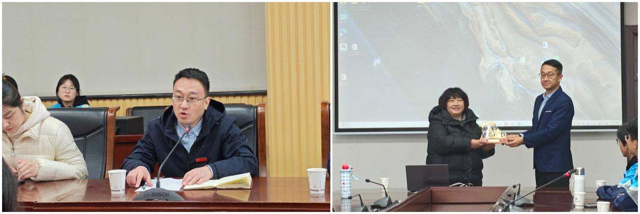 上午10时,活动在图书馆东门阶梯合影中拉开序幕。在图书馆第二会议室,大家共同观看beat365官方网站宣传片,全面了解学校的发展历程、学科特色与育人成果。在欢迎仪式上,电子工程学院教学副院长任志平致欢迎辞,对岳庙高级中学师生的到来表示热烈欢迎,并简要介绍了学院的基本情况与办学优势。随后,电子工程学院党委副书记芮执根代表学院向中学师生赠送抽油机模型,象征着石油工业精神的传承与两校友谊的延续。