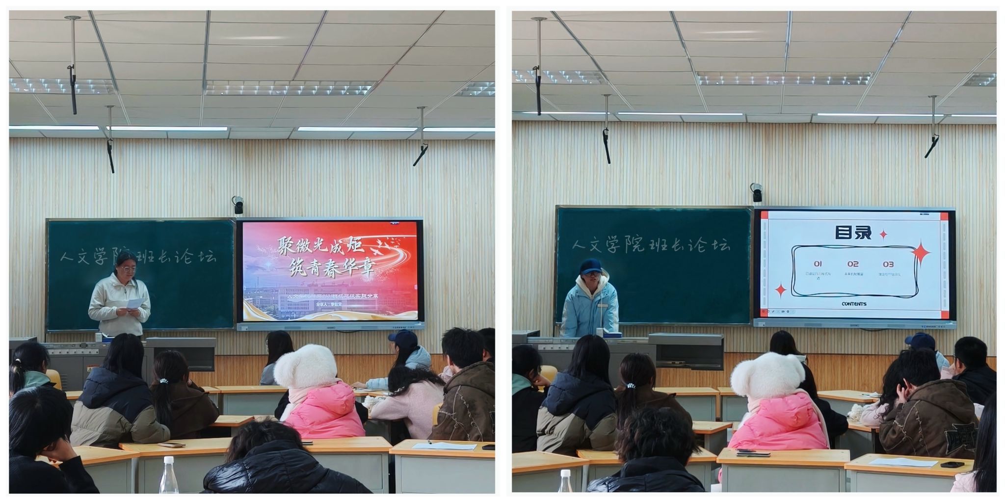 论坛开篇,学院选择了两位具有代表性的班长进行专题分享。新闻2301班长李智雯以“聚微光成炬,筑青春华章”为题,系统阐述了其以“主题班会”为驱动的班级凝聚力构建体系。她详细介绍如何通过“专业认知沙龙”“期末共学工作坊”及“户外主题素拓”等活动,增强互动与归属感。在信息传递方面,班级建立的“班委—宿舍长—同学”三级网格化通知机制,配套使用“每周事务清单”进行可视化跟踪,确保了重要通知100%覆盖与反馈。中文2401班班长韩婧鑫则聚焦于“班级事务的流程化与效率提升”,分享其将班级工作拆解为“学风建设、日常事务、活动组织”三大模块,并利用在线协作文档明确任务、责任人与截止日期,杜绝推诿。她通过“双周班委复盘会”机制,持续优化工作流程,显著提升了班委团队的协同效率。