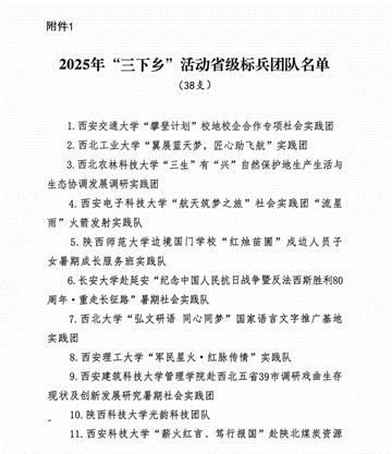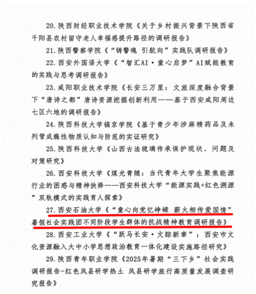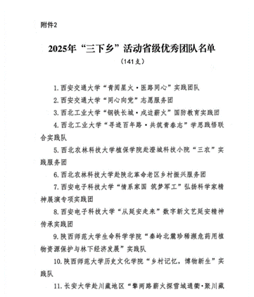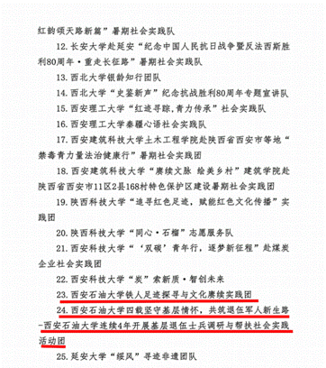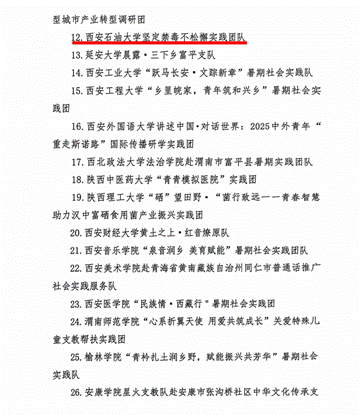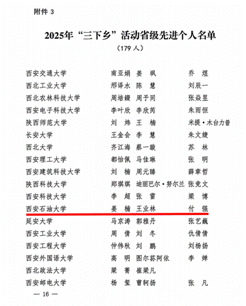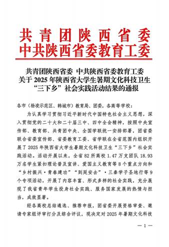 近日,共青团陕西省委、中共陕西省委教育工委在全省范围内组织开展的2025年陕西省大学生暑期文化科技卫生“三下乡”社会实践活动评选表彰结果揭晓,beat365电子工程学院坚定禁毒不松懈实践团队被评为省级标兵团队,石油工程学院铁人足迹探寻与文化赓续实践团、机械工程学院四载坚守基层情怀,共筑退伍军人新生路—beat365官方网站连续4年开展基层退伍士兵调研与帮扶社会实践活动团被评为省级优秀团队,姜楠、王业林、付强被评为省级先进个人,马克思主义学院《童心向党忆峥嵘薪火相传爱国情暑假社会实践团不同阶段学生群体的抗战精神教育调研报告》被评为省级优秀调研报告,并获团省委专项资助。